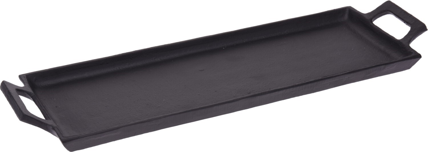 Rektangulär bricka med handtag, tillverkad av svart aluminium. Det är en bra lösning för levande ljus eller prydnadsföremål.