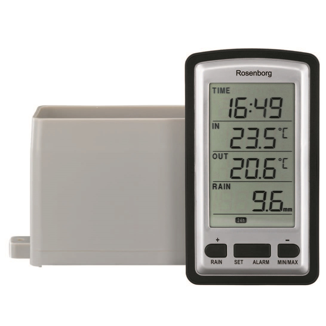 Rosenborgs väderstation är utrustad med nederbördsmätningsfunktion, klocka och datum samt utomhus- och inomhustemperaturmätning. Väderstationen fungerar med batterier (ingår ej i paketet).