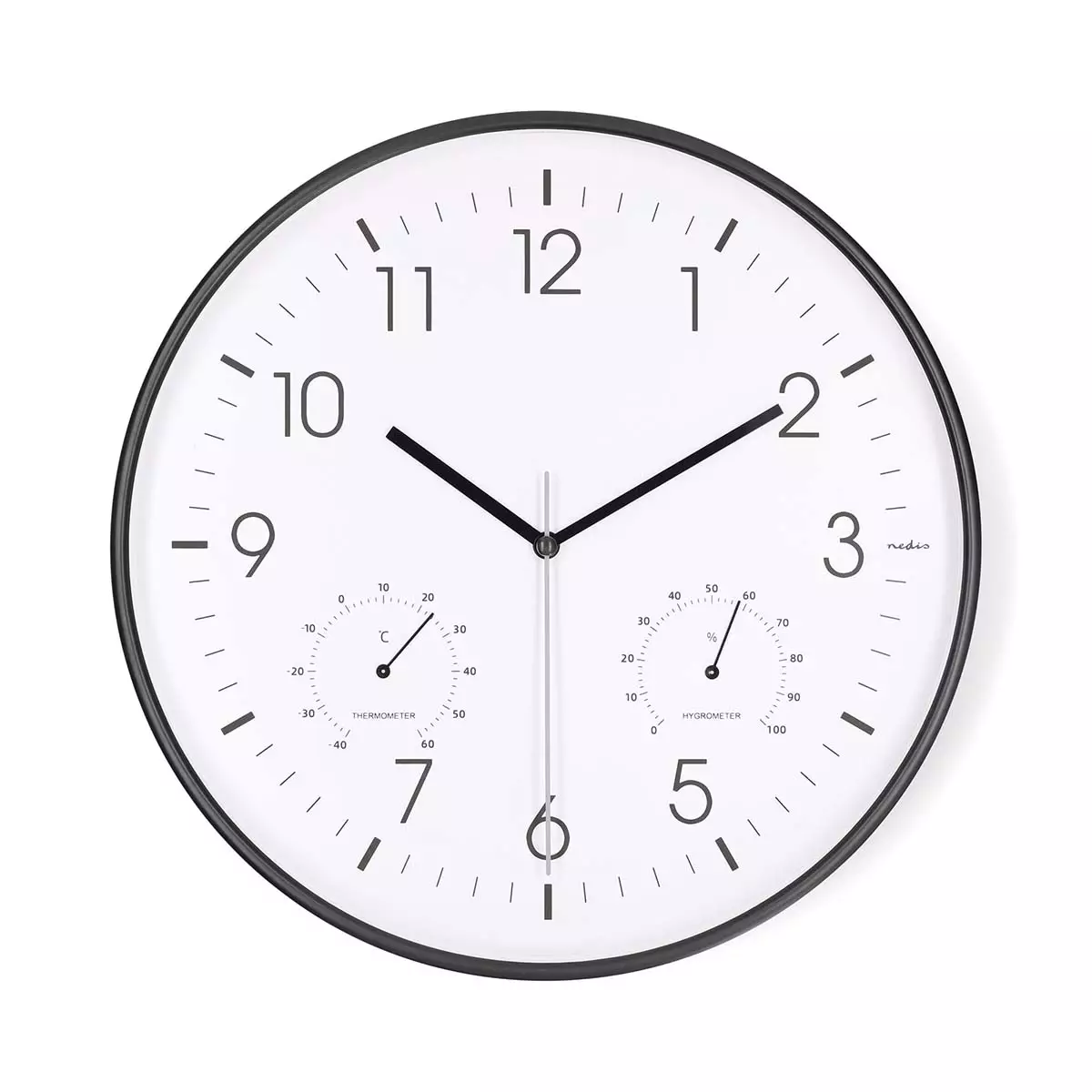 Väggklocka | Diameter: 300 mm | Plast | Tyst rörelse | Termometer (temperatur) | Hygrometer | Svart / Vit