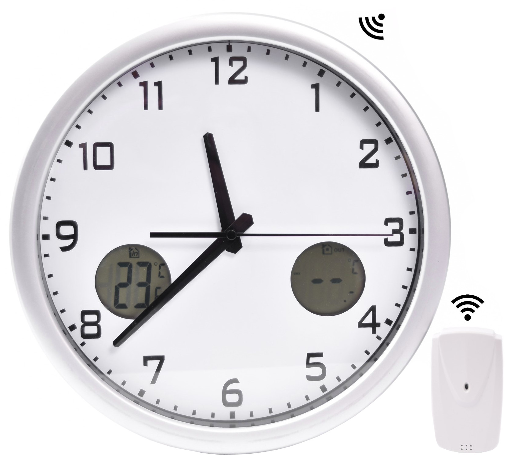 Väggklocka med inomhus och utomhus termometer. Innehåller trådlös sändare för utetemperaturmätning. Mycket snygg och praktisk väggklocka.