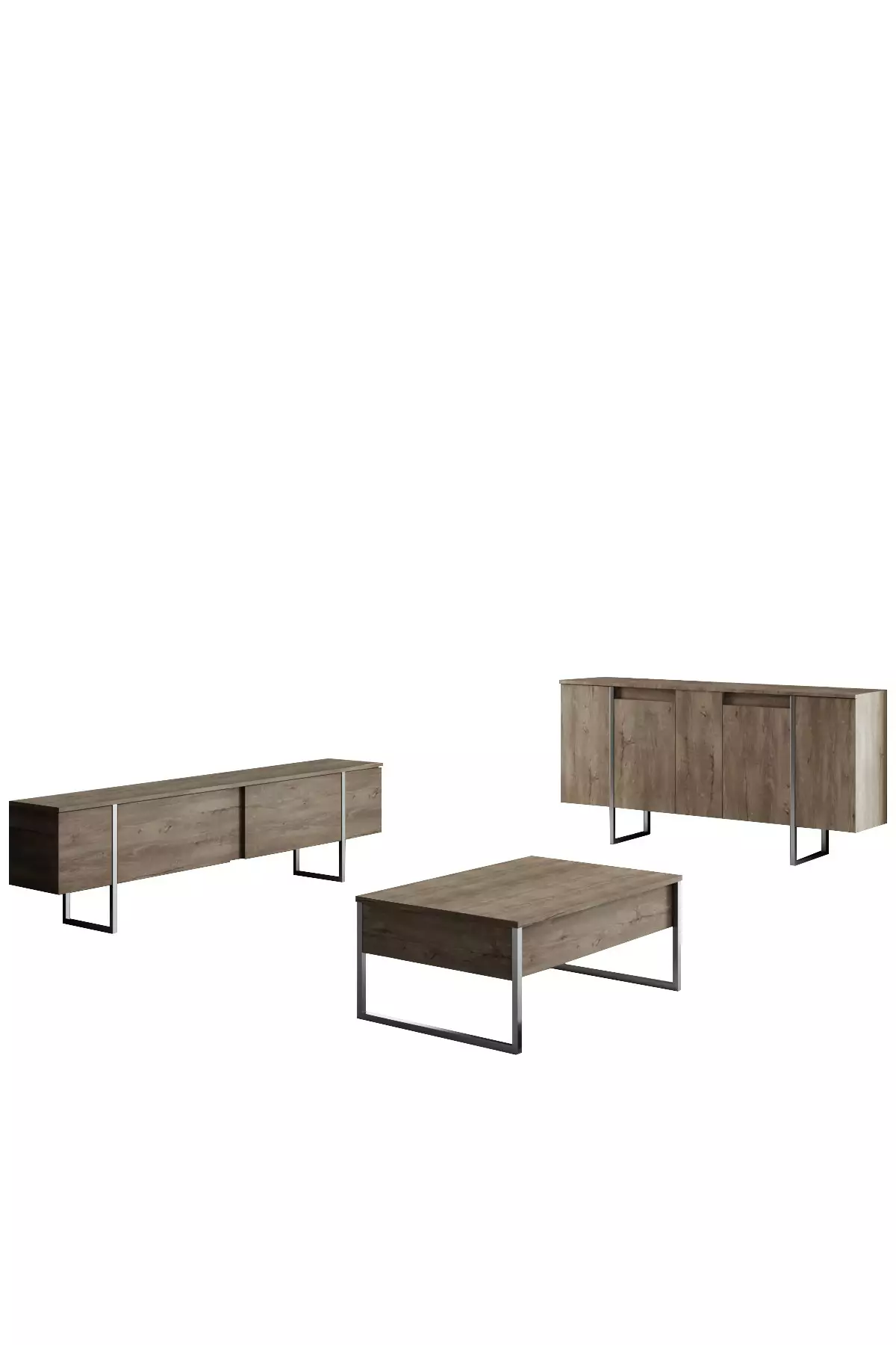 Förvandla ditt vardagsrum till ett elegant och modernt rum med våra vardagsrumsmöbler. Setet är tillverkat av 100 % melaminbelagd spånskiva och är inte bara hållbart utan också otroligt snyggt och elegant. Metallbenen ger en touch av sofistikering, vilket gör den här uppsättningen perfekt för alla moderna hem.