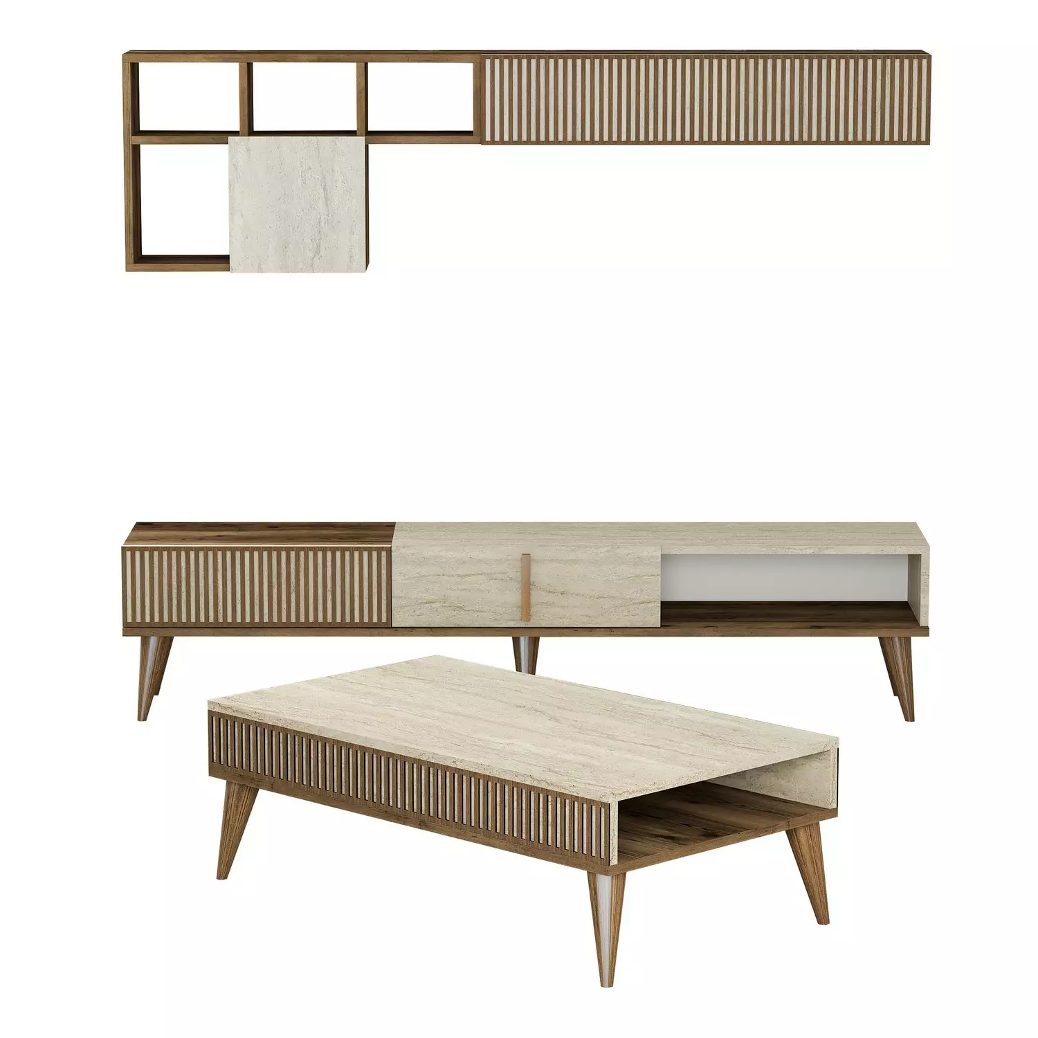 TV -stativet, vägghyllan och soffbordet som ingår i denna uppsättning är utformade för att förbättra estetiken i ditt vardagsrum. Den eleganta designen och valnöts- och travertinfärger ger en touch av modernitet till alla rymden, medan marmorkonceptet ger en känsla av överflöd.