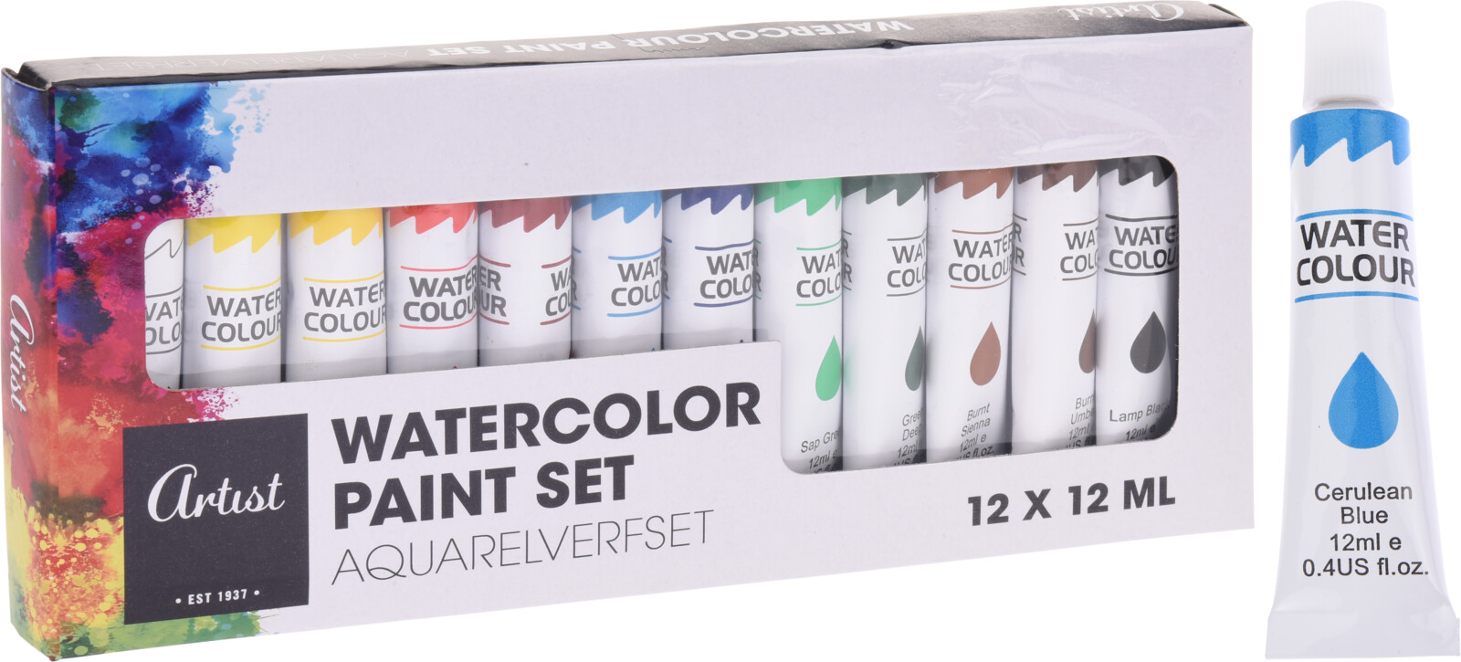 Paketet innehåller 12 akvarellfärger i olika nyanser.