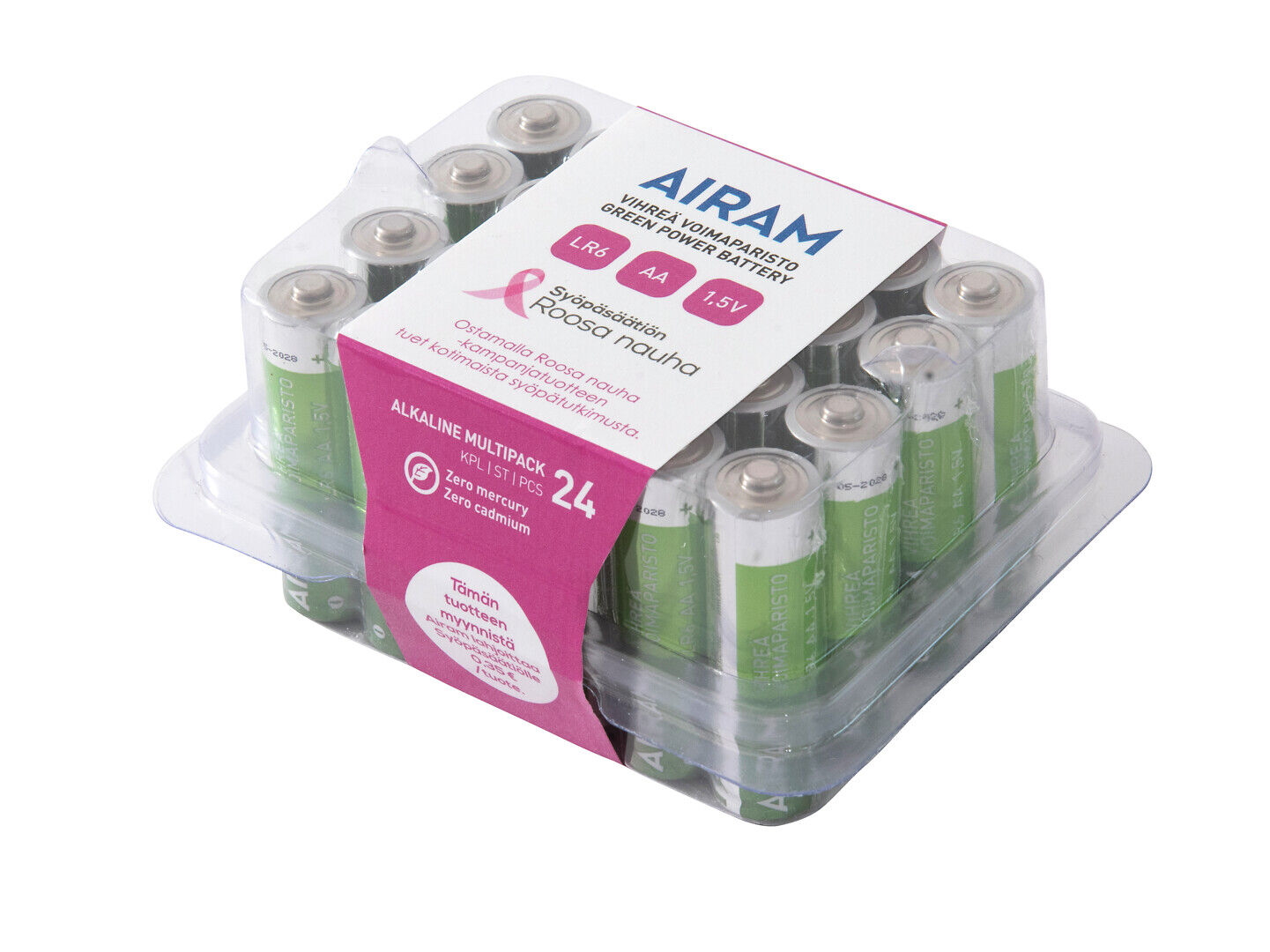 Försäljningen av Airams Rosa Bandet -produkter stöder cancerforskning. Green Power alkaliskt batteri är ett universellt alkaliskt batteri som alltid behövs hemma, i stugan och var du än tillbringar ditt dagliga liv! Paketet innehåller 24 st LR6 AA-batterier. Används ofta som strömkälla i batteridrivna produkter som ficklampor, dekorativa lampor, barnleksaker, fjärrkontroller ... etc.