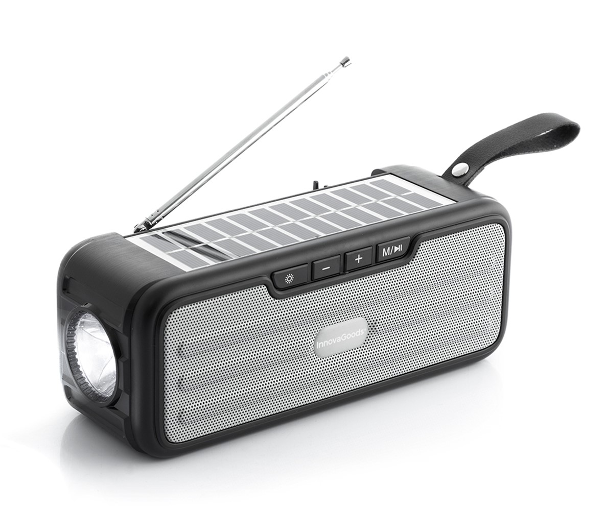 InnovaGoods Bluetooth-högtalare är mångsidig och multifunktionell, den kan användas som ficklampa och radio. Enheten kan laddas via USB-anslutning eller via solceller i solljus. Enheten är utrustad med ett LED-ljus med 3 olika intensiteter och har även Bluetooth 5.0, antenn, FM-radio och handsfree-funktion för att ta emot samtal (inbyggd mikrofon).