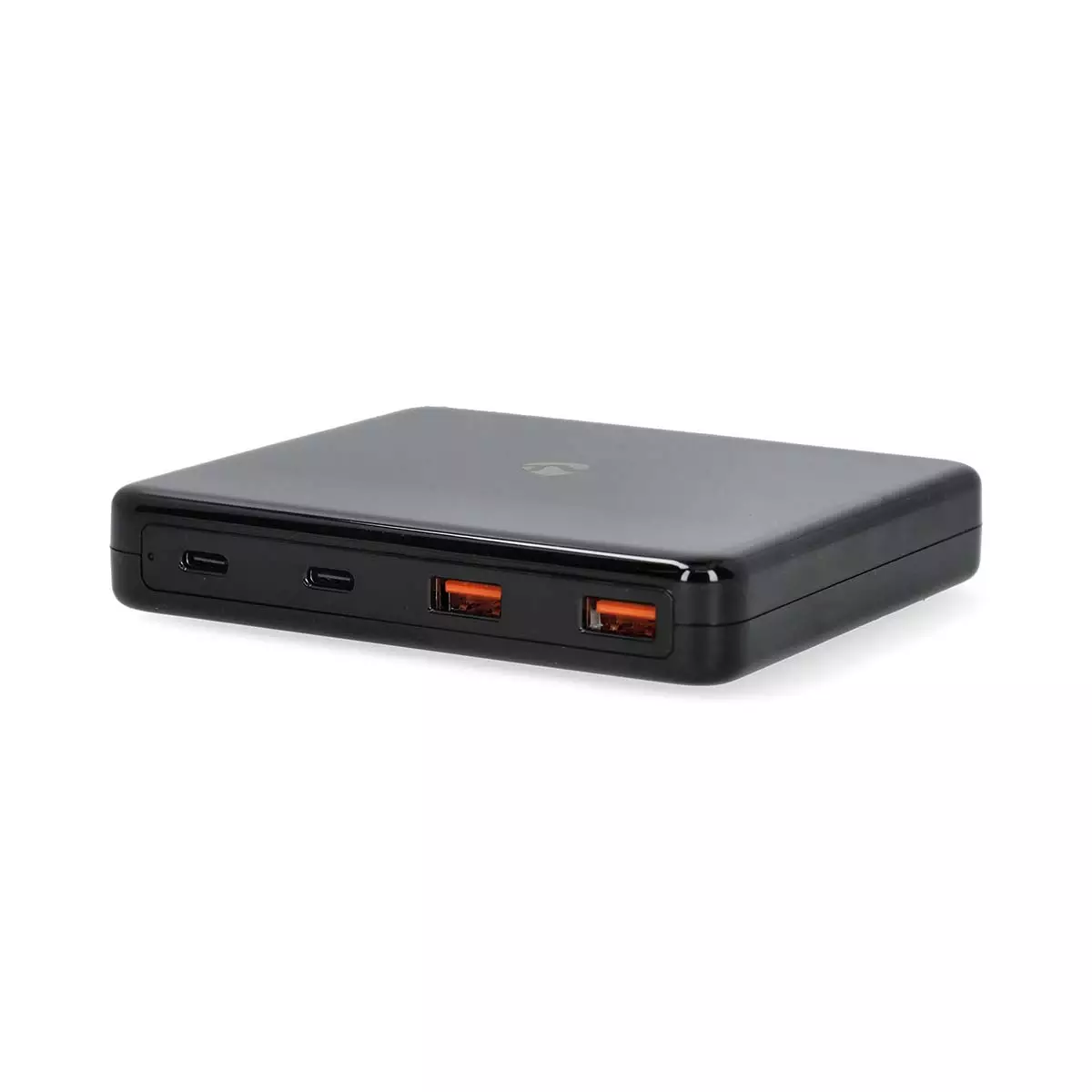 Med denna Nedis USB-C GaN-laddare kan du ladda en USB-C-driven bärbar dator men även upp till tre andra enheter som en smartphone, en surfplatta eller en USB-enhet som Nintendo Switch samtidigt. Denna 65 Watt laddare fungerar med USB Power Delivery-teknik för att ladda din enhet snabbare och mer effektivt. Den har fyra portar, två med USB-C och en laddningsström på upp till 3,25 A och två med USB-A och en laddningsström på upp till 3,0 A för snabbladdning. Den smarta IC-tekniken känner automatiskt av den ström som krävs. Laddaren är inte bara idealisk för användning hemma eller på jobbet, utan på grund av sin kompakta storlek också en perfekt reselösning. GaN-teknik Galliumnitrid (GaN) är en ny teknik av hög kvalitet. GaN-transistorer producerar mindre värme, kräver mindre utrymme mellan komponenterna och gör att laddarna kan bli mindre samtidigt som de ger all kraft från en stor laddare. Denna turboladdare med upp till 65 watt effekt kan ladda till exempel en Apple iPhone 12 upp till 61 procent batteritid på bara 30 minuter.