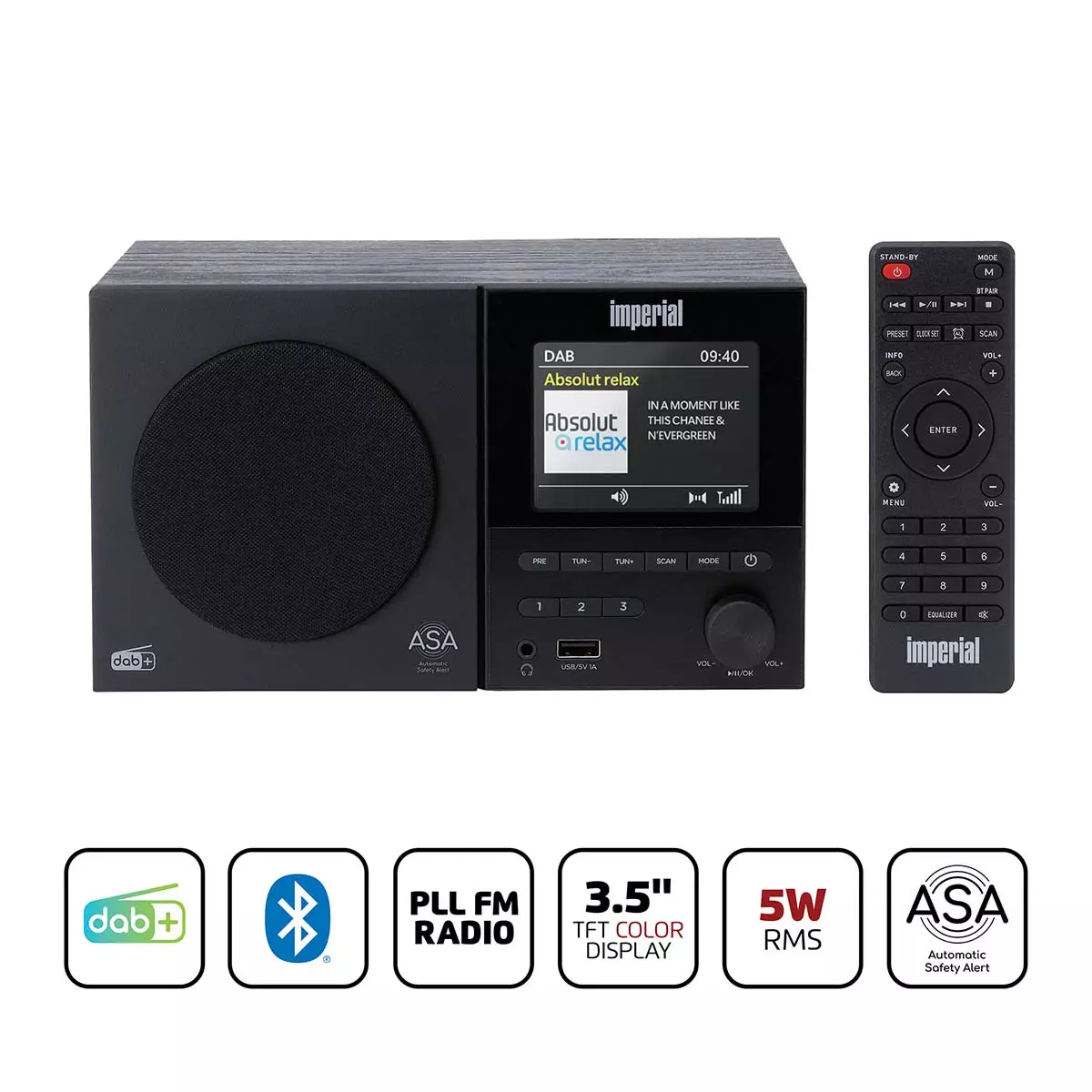 Upplev klart ljud och mångsidig funktionalitet med Imperial DAB+/FM-radio, utformad för modern lyssning i ett klassiskt trähus. Den här radion kombinerar avancerade funktioner med lättanvända reglage, vilket gör den idealisk för användning i hemmet, på kontoret eller vid sängen. Njut av tillgång till både DAB+- och FM-stationer, med möjlighet att spara upp till 30 favoritstationer på varje band. Tre fritt tilldelningsbara förvalsknappar ger snabb åtkomst till dina mest älskade kanaler. Den stora 9 cm (3,5") TFT-färgdisplayen ger enkel navigering och tydlig stationsinformation. Utrustad med Automatic Safety Alert (ASA)-systemet håller denna radio dig informerad om viktiga meddelanden. Bluetooth V5.3 möjliggör sömlös trådlös streaming från din smartphone eller surfplatta, medan USB-porten stöder både musikuppspelning och laddning av enheten. Den inbyggda 5 Watt RMS-högtalaren levererar klart och balanserat ljud, perfekt för avslappnad lyssning. Ytterligare funktioner inkluderar en väckarklocka med dubbla alarm, snooze-funktion och sömntimer, vilket gör den till en pålitlig följeslagare för alla rum. Med sin kombination av traditionell design, moderna anslutningsmöjligheter och praktiska funktioner erbjuder Imperial DAB+/FM-radio bekvämlighet, kvalitetsljud och mångsidighet för daglig användning.