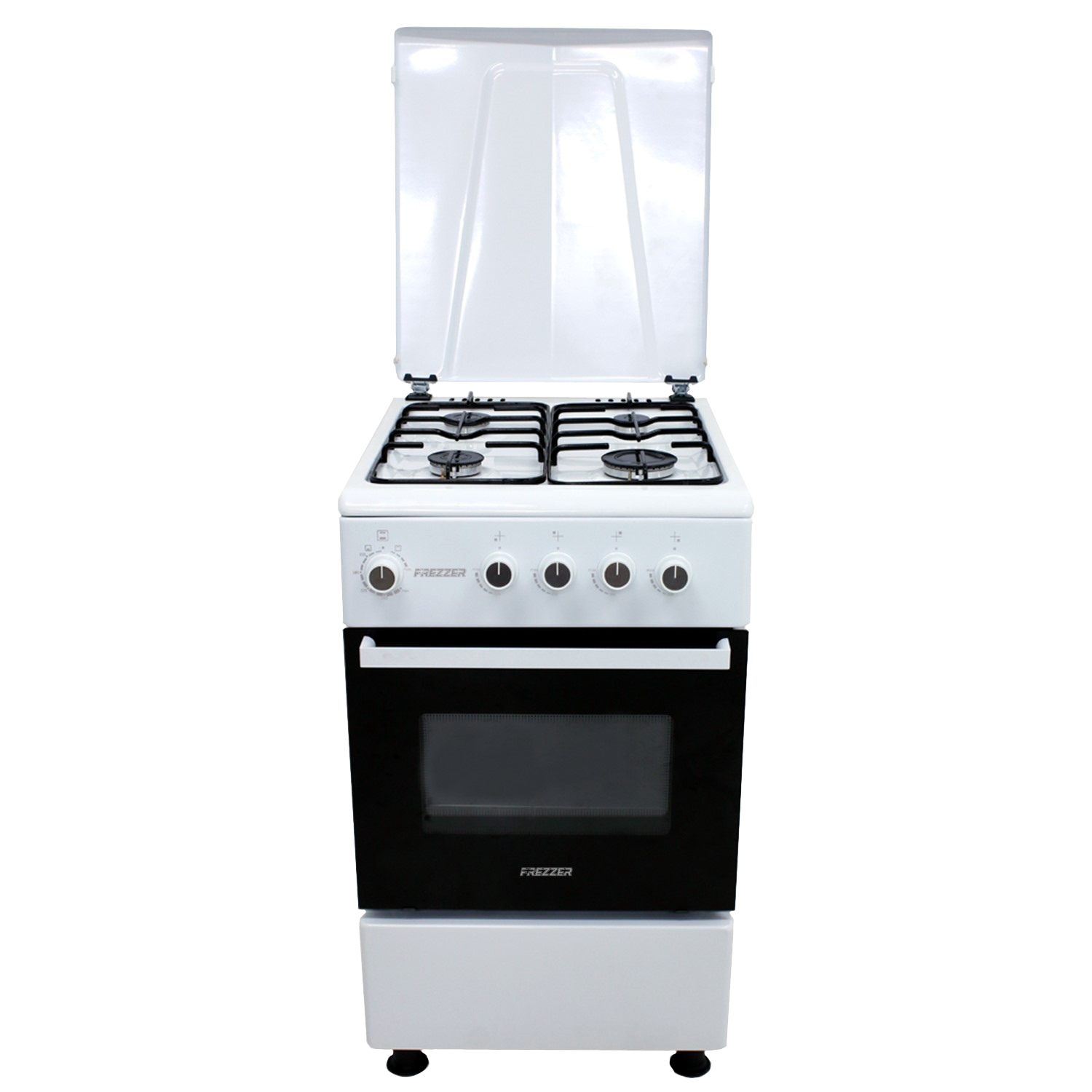 Frezzer har fyra gasbrännare på spisen. Ugnen har en vanlig gasbrännare, med grillfunktion. Metallocket gör spisen till en praktisk avlastningsbänk. Det dubbla glaset i luckan skyddar mot brännskador för den som står framför spisen. Elegant och smart gasspis för hem och stuga.