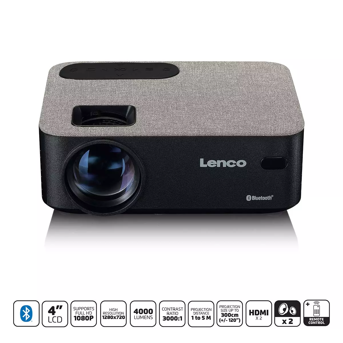 Lencos LPJ-700BKGY LCD-projektor gör att du kan projicera alla dina filmer, spel och presentationer skarpt. Beamer är lätt att bära med sig och använda. Slå på den och justera skärpan/höjden så är du redo att använda den. Med de inbyggda stereohögtalarna är du garanterad bra ljud. Beamer är utrustad med Bluetooth® så att du kan skicka filmljudet trådlöst till en extern Bluetooth® soundbar eller högtalare. LPJ-700 har också de vanliga ljud- och videoingångarna som HDMI, USB och SD. Viktiga funktioner • Kraftfull HD-projektor med en upplösning på 1.280 x 720 (720P). • Idealisk för spel, filmer och presentationer • Bluetooth® 5.0 för strömmande ljud • Enkel att använda och styra (fjärrstyrd) • Utmärkt bildkvalitet (ljusflöde på 4.000 lumen) • Nästan oändlig tittarglädje eftersom LED-lampan håller i genomsnitt 30.000 brinntimmar • Kan placeras var som helst med sin kompakta design och snygga tygfinish Strömma med Bluetooth® 5.0 Bluetooth® 5.0 är dubbelt så snabb som sin föregångare Bluetooth® 4.2. En enhet med Bluetooth® 5 ansluter snabbare till andra Bluetooth®-enheter och överför data snabbare. Strömmar du musik eller bilder? Då kommer du knappast att märka någon fördröjning. För en perfekt lyssningsupplevelse kan du helt enkelt strömma ljudet trådlöst och direkt från projektorn till en stereoanläggning, soundbar, hörlurar eller bärbara högtalare. Alternativt kan du använda LPJ-700:s egna stereohögtalare. Biografupplevelse Förvandla ditt vardagsrum till en riktig biograf med Lenco LPJ-700. Med en ljusstyrka på 4 000 Lumen och ett kontrastförhållande på 3 000:1 får du en utmärkt och tydlig bildkvalitet. Den är perfekt för när du streamar TV, filmer, Netflix-serier eller spel via en cast-dongle (t.ex. Chromecast). Upplösningen på denna HD-projektor är 1 280x720 och stöder full HD 1080P. Den här projektorn har ett projektionsavstånd på 1 till 5 meter för den mest optimala bilden. Dessutom är den maximala projektionsstorleken för denna enhet 3 meter. Allt du behöver för din egen hemmabio. Lätt att använda Lenco LPJ-700 är kompakt och kan placeras var som helst. Den här projektorn är snabb och effektiv att använda. Förutom Bluetooth®-anslutningen har projektorn många anslutningsmöjligheter, t.ex. 2 HDMI-portar, 1 USB-port, 1 Micro-SD-kortplats, 1 AV- och 1 VGA-anslutning. Beamer är MHL-kompatibel så att du enkelt kan ansluta din Android- eller Apple-enhet med en MHL-kabel (tillval). Den medföljande fjärrkontrollen kompletterar LPJ-700. Ingång • 1 x USB A • Micro SD-kortplats • 2 x HDMI • CVBS mini AV på 3,5 mm • VGA Utgång • 3,5 mm hörlursutgång Stödjer format • MP3 / WMA • BMP / JPEG • AVI / MKV / MP4 (XVID) / VOB