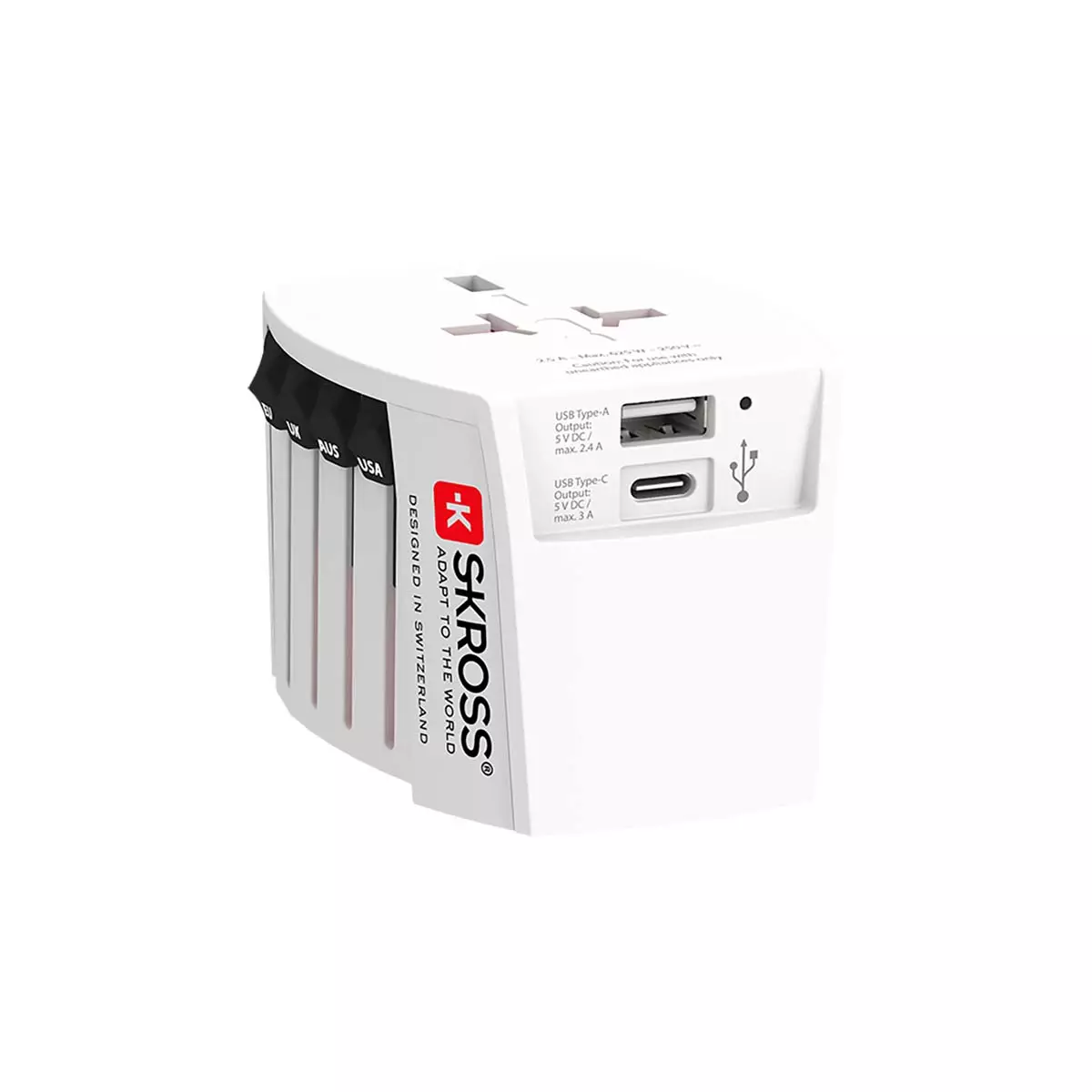 Med World Adapter MUV USB (AC) från SKROSS® kan resenärer från hela världen ladda både en USB C-enhet och en vanlig USB-enhet samtidigt som de ansluter en 2-polig enhet. Reseadaptern har en tilltalande kompakt form och kan användas på mer än 220 destinationer över hela världen.