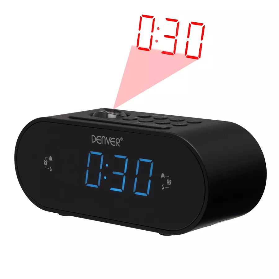 En mångsidig klockradio som väcker dig med ditt favoritradioprogram eller en signalton. Klockan projiceras på väggen.