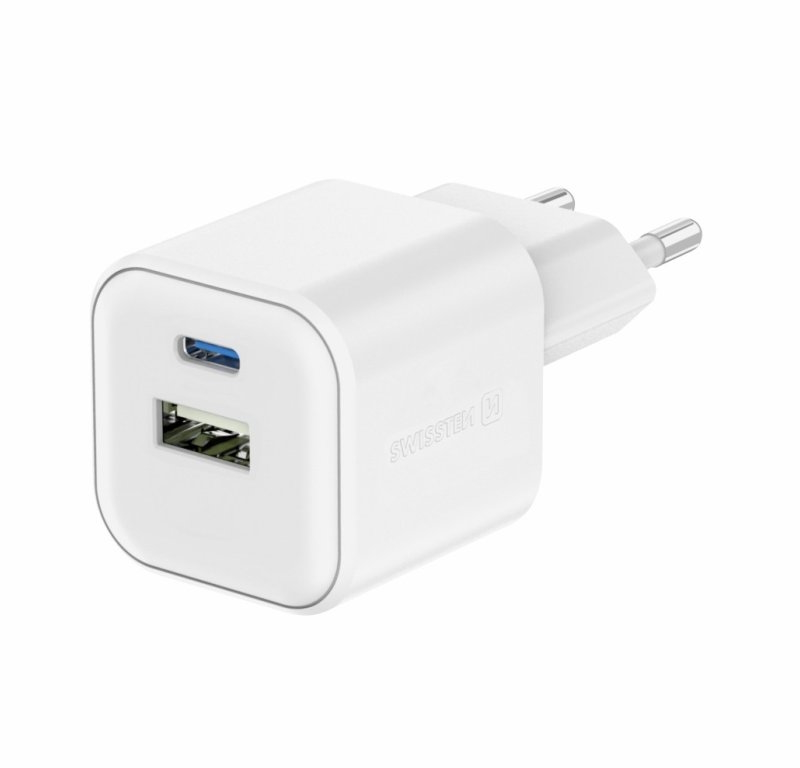 Swissten reseadapter GaN 1x USB-C 35W PD + 1x USB-A 27W QC vit. Swissten-laddare, max. effekt 35 watt, 1x USB-C / 1x USB-A QC 4.0, GaN-teknologi, skydd mot kortslutning, övervoltning, överbelastning och höga temperaturer, Kompakt dimensioner.