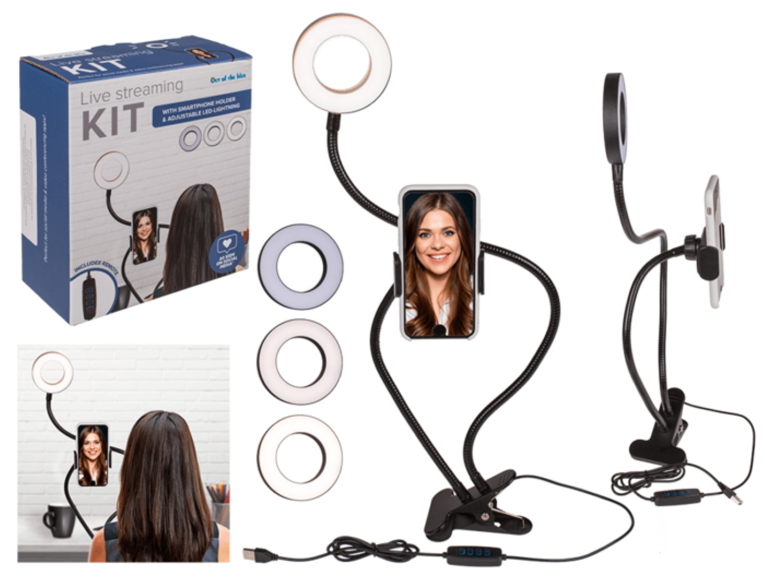 Ett utmärkt set för dig som sänder live, filmklipp och bilder på sociala medier via en smartphone. Satsen innehåller en telefonhållare (fäst på fästet) och en LED-lampa för förbättrad belysning. Setet innehåller även en USB-laddningskabel.