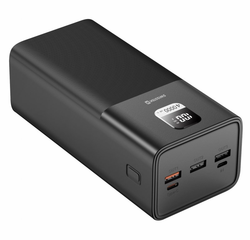 Swissten reservkraftkälla 40 000mAh 100W Swissten är lämplig för snabbladdning och är tillverkad av icke-brännbart material. Reservkraftkällan är utrustad med ett batteri på 40 000 mAh (148 Wh), 100 W effekt och stöder snabbladdningsmetoder såsom PowerDelivery 3.0, Qualcomm 3.0 och Huawei SCP.