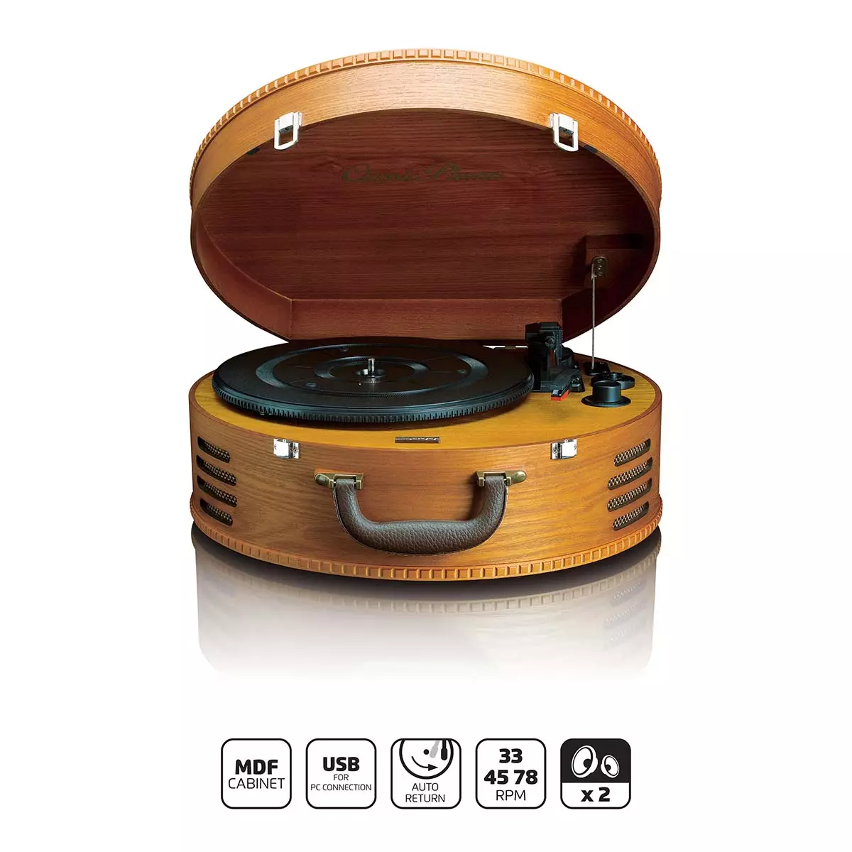 Classic Phono TT-34 är en vacker och stilren skivspelare med USB-utgång i en riktig retrolook. Skivspelaren är förpackad i ett vackert och praktiskt runt träfodral, så att du kan ta med den överallt. Med TT-34 har du alltid din favoritmusik till hands, vart du än går. Skivspelaren är en användarvänlig apparat utan några krusiduller. Tack vare de inbyggda högtalarna kan du spela din favoritmusik i hög kvalitet. Ta med dig fodralet till en födelsedag eller en återförening och förvåna alla med otaliga gamla och nya hits. Fråga dina vänner och din familj i förväg om de också vill ta med sig sin favoritskiva så blir det en fest att minnas. Anslut skivspelaren till din dator via USB och konvertera din vinylsamling till digitala MP3-filer. Classic Phono TT-34 har en keramisk stereopatron med nål. Du kan spela dina skivor i 3 hastigheter: 33 RPM, 45 RPM och 78 RPM, och spelaren har också automatisk återgång. Skivspelaren är utrustad med remdrift och 2 inbyggda högtalare.