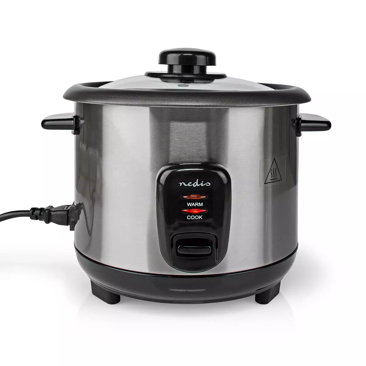 Med Nedis riskokare med hölje i rostfritt stål kan du tillaga utsökt ris på nolltid. Du behöver inte längre oroa dig för att riset ska överkokas, eftersom den automatiskt växlar till varmhållningsfunktionen när riset är kokt. Riskokaren har en kapacitet på 1 liter och effekt på 400 watt som gör att du kan tillaga upp till fem portioner ris samtidigt. Detta gör att kokaren lämpar sig för att förbereda middag för hela familjen. Det är naturligtvis även möjligt att tillaga mindre mängder ris. Riskokaren har ett glaslock och en innerskål med non-stickbeläggning, så riset inte fastnar i skålen. Innerskålen är löstagbar och enkel att rengöra. Levereras med sked och mätkopp. Förutom alla risvarianter kan många fler typer av kornmat tillagas med en ris kokare. Quinoa, couscous, hirs eller korn är bara några exempel. Den exakta mängden vatten och tillagningstid kan variera beroende på typ av korn, så det är rekommenderat att kontrollera tillagningsinstruktionerna för varje specifikt korn och justera efter behov.
