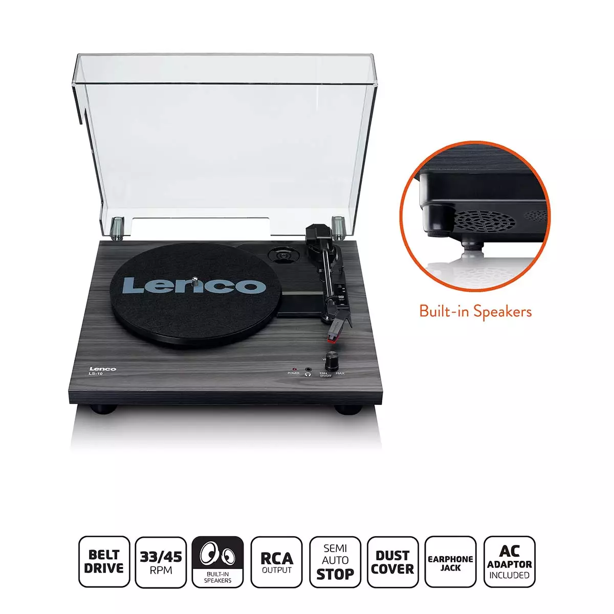 Lenco LS-10 är en modern skivspelare med två inbyggda högtalare. Njut av dina favoritvinyler med en enkel knapptryckning. Glöm komplicerade musiksystem, för Lenco LS-10 väcker dina skivor till liv på ett enkelt sätt. Oavsett vilken musik du lyssnar på kan du enkelt växla från 33 till 45 RPM. För mer volym kan du använda externa högtalare via RCA-anslutningen på baksidan av skivspelaren. På så sätt fylls varje rum med musik. Skivspelaren har också en utgång för hörlurar, så att du kan lyssna på din favoritmusik utan att någon annan hör den. Avtagbart dammskydd av plastNaturligtvis vill du att din skivspelare ska hålla länge. För att säkerställa att spelaren inte blir full av damm har Lenco LS-10 ett avtagbart dammskydd i plast. Det gör att skivspelaren ser ut som ny. Inbyggd stereoförförstärkareVill du höra din musik med hög volym? Det fungerar utmärkt. Eftersom den här skivspelaren har en inbyggd stereoförförstärkare. Det innebär att du inte behöver köpa en separat förförstärkare och att du kan ansluta skivspelaren direkt till din stereoanläggning.