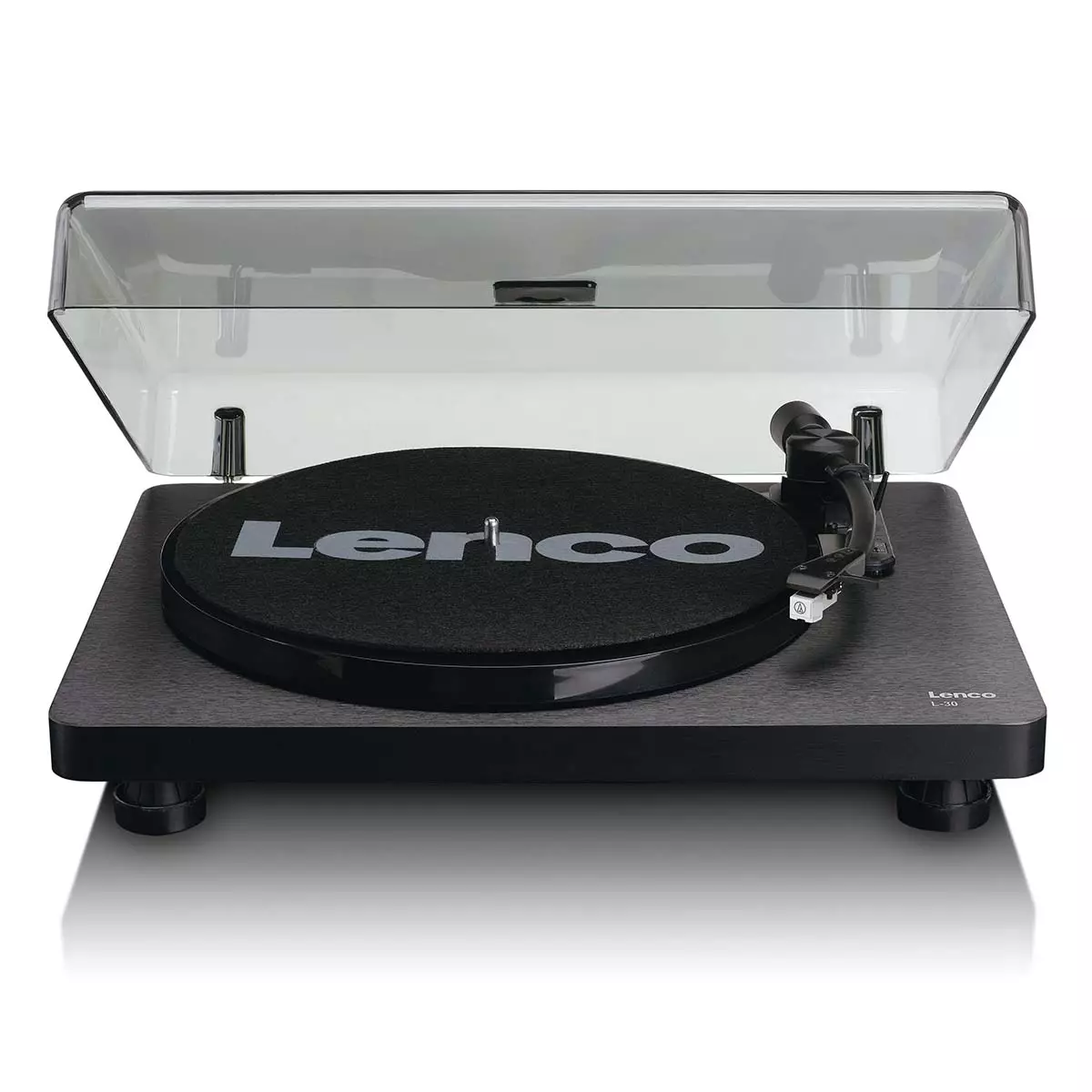 Lenco L-30 är en skivspelare som får dina favoritskivor att låta fantastiskt. Den trendiga designen och den moderna tekniken gör den här skivspelaren perfekt för alla musikentusiaster. Lenco L-30 finns i 2 varianter: svart och trä. Vill du kunna spela upp dina favoritljud från förr för dina barn? Lenco L-30 ger ett fantastiskt ljud av hög kvalitet och dina barn kommer att bli förvånade. Skivspelaren är så enkel att använda att du till och med kan låta dem spela en skiva själva. Lenco L-30 är utrustad med en MMC (Moving Magnet Cartridge), autostopp, remdrift och en inbyggd förförstärkare. Du kan spela skivor i två hastigheter: 33 RPM och 45 RPM. Ett löstagbart plasthölje skyddar skivspelaren från damm. Med åren blir dina skivor gamla och ömtåliga. För att förhindra att din favoritmusik går förlorad för alltid kan du digitalisera din älskade vinylsamling med hjälp av Lenco L-30. Anslut skivspelaren till din dator via USB-porten och konvertera enkelt din vinyl till en digital ljudfil. Vart du än går kommer du alltid att ha din favoritmusik med dig.