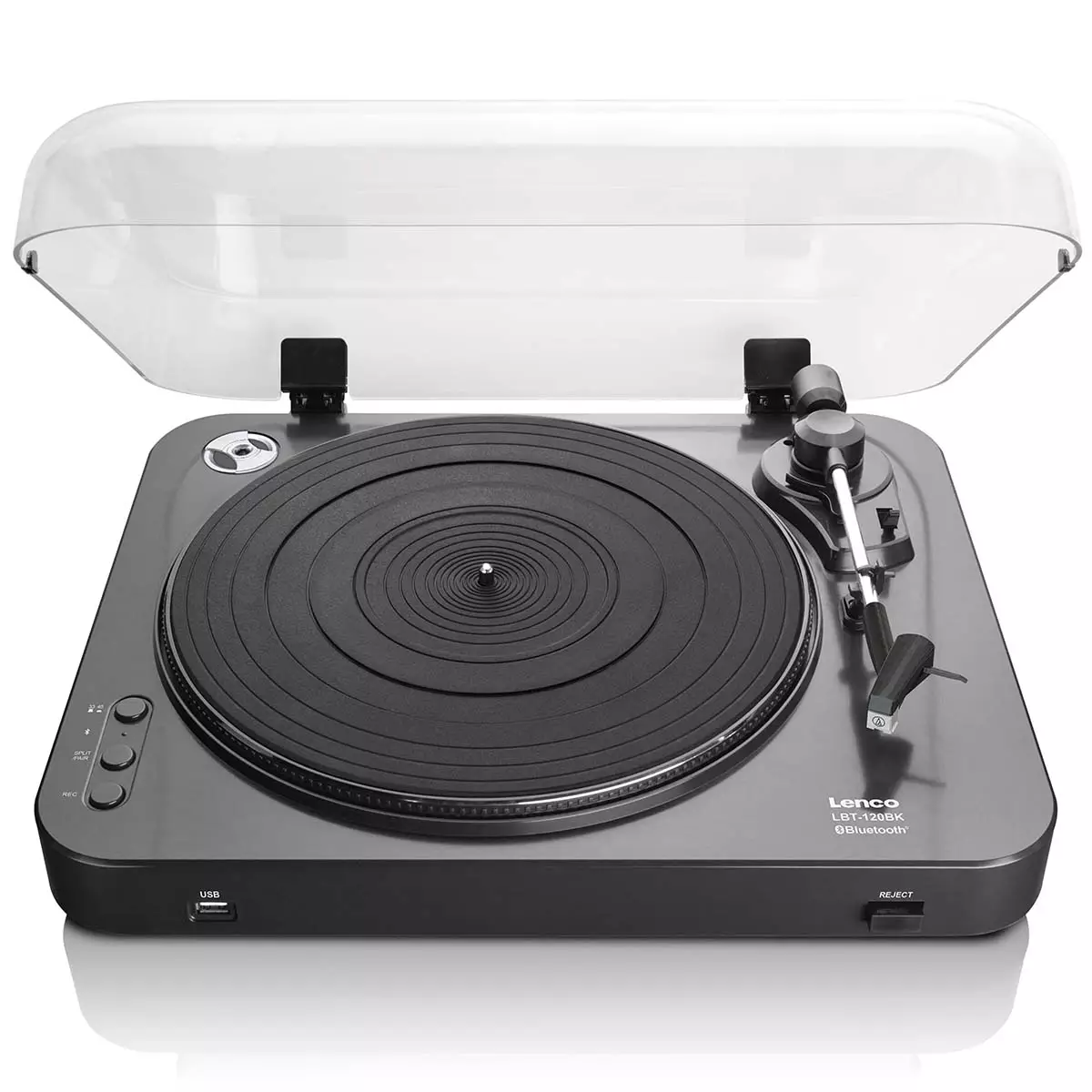 Lenco LBT-120BK skivspelare är en halvautomatisk skivspelare med Bluetooth®-funktionalitet. Du kan ansluta skivspelaren till din Bluetooth®-högtalare på några sekunder och njuta av ett fylligt och varmt ljud från soffan. Ta fram dina gamla skivor från vinden och spela dem på den här moderna skivspelaren. Njut av det kristallklara ljudet från dina vinylskivor, både gamla och nya. Växla från 33 till 45 varv för att spela din LP eller singel i rätt hastighet. Och vad händer om du vill njuta av dina favoritskivor när du cyklar, i bilen eller på tåget? Lenco LBT-120BK digitaliserar alla dina favoritskivor via den inbyggda USB-porten. Du kan föra över inspelningarna till ett USB-minne på nolltid och ha dem med dig i fickan. Lenco är fullt medveten om att du vill behandla dina vinylskivor så varsamt som möjligt, så Lenco LBT-120BK skivspelare är halvautomatisk. När det sista spåret är slut lyfts pennan automatiskt av skivan och tonarmen återgår till sitt stöd. Detta förhindrar repor så att du kan njuta av dina älskade skivor längre. Lenco LBT-120BK levereras med ett dammskydd som håller din Lenco fräsch och ren under korta perioder när du inte använder din skivspelare.