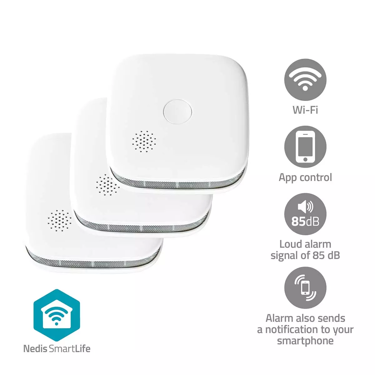 Med Nedis smarta brandvarnare kan du alltid känna dig trygg, även när du inte är hemma. När rök upptäcks skickar enheten ett meddelande till din smartphone och ett högt larm hörs. Anslut rökdetektorn till Wi-Fi så får du meddelanden via Nedis kostnadsfria SmartLife-app. I appen ser du omedelbart i vilket rum din anslutna smarta brandvarnare hörs. Det innebär att du kan agera målinriktat i en nödsituation. Den kompakta storleken på endast 76 x 76 x 28.5 mm innebär att du kan placera den var som helst i bostaden. Det gör också att den blir diskret och smälter in i inredningen. Via Nedis SmartLife-app kan brandvarnaren anslutas och kombineras med dina andra smarta hemprodukter för extra säkerhet. När rök upptäcks kan du exempelvis se till att lamporna tänds, att persiennerna öppnas eller att andra automatiseringar utförs för att göra ditt hem så säkert som möjligt. Brandvarnare drivs med batteri som har hög hållbarhet och en livslängd på upp till två år. När batteriet börjar ta slut får du ett meddelande på smarttelefonen. Det gör att du slipper bli störd av irriterande pipljud mitt i natten. Om Nedis SmartLifeUpptäck ett stort och ständigt växande sortiment av produkter, till exempel lampor, strömbrytare, uttag, sensorer och kameror, som alla kan styras via en lättanvänd och intuitiv app. Med röststyrningsfunktioner som stöds av Amazon Alexa och Google Home och utan behov av något annat än ditt befintliga Wi-Fi-nätverk blir det här ett uppkopplat, smart hem som genomförs på ett enkelt sätt. Oavsett om du letar efter en enda smart lampa eller ett uttag, eller om du vill automatisera hela huset, kan du upptäcka hur lättillgänglig smart teknik är i dag.