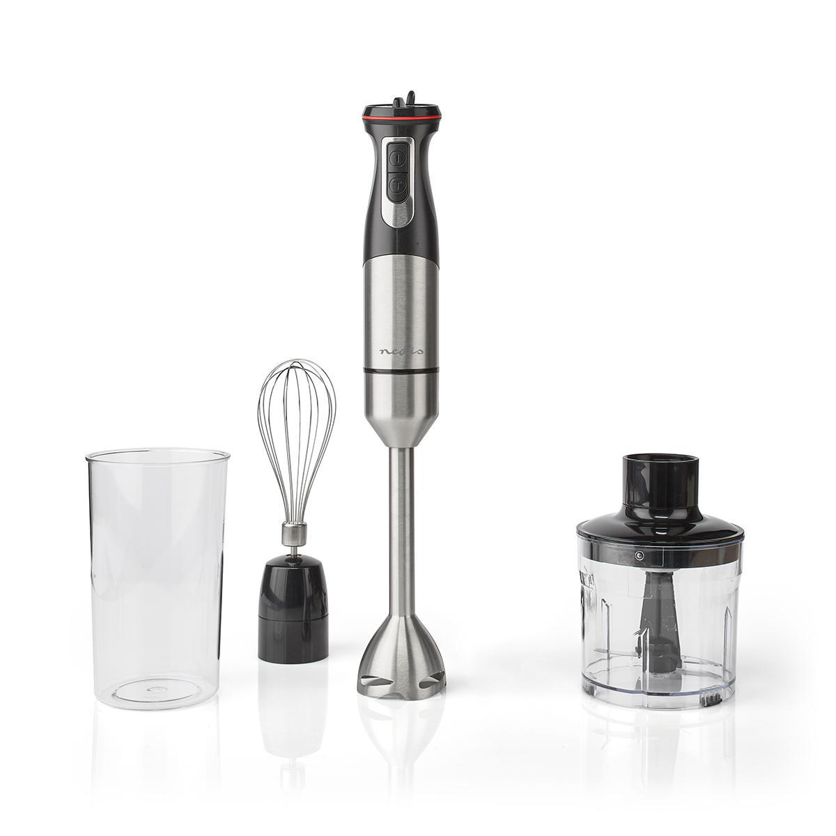 Den moderna ytan i rostfritt stål gör att den här mixerstaven passar i alla kök. Ditt kök blir komplett med den här kompakta 4-i-1-mixersatsen som innehåller en stavmixer, en hackare för att till exempel göra blomkålsris, en visp för mjölk till cappuccino eller ägg till en omelett och en praktisk behållare för att blanda eller hälla dina mixade godsaker i. Att blanda och mixa soppor, såser och smoothies har aldrig varit så här enkelt. Mixersatsen är snabbare, mer praktisk och kräver mindre rengöring än en stativmixer. Den har axel och blad i rostfritt stål och flera hastighetsinställningar som gör att den även kan hantera hårda grönsaker och frukt. Vi vill att du ska kunna mixa snabbt, enkelt och ha full kontroll. Därför har den här mixern olika hastighetsinställningar, en turbofunktion och mycket vassa blad av rostfritt stål som skär igenom nästan allt. Det fungerar tack vare motorn på 800 W och med endast en knapptryckning. I Nedis 4-i-1-mixersats ingår en behållare på 900 ml. Mixa direkt i behållaren med stavmixern och få rätt mängd ingredienser direkt. Hackaren på 500 ml fungerar bra när du ska hacka lök, nötter och blomkål medan stavmixern är perfekt för att göra släta soppor, barnmat, juice och smoothies. Alla tillbehör i mixersatsen är diskmaskinssäkra, men även enkla att rengöra med varmt vatten och lite diskmedel. Om du använder stavmixern dagligen rekommenderar vi att du tar bort axeln från mixern och handdiskar den för att behålla den i nyskick.
