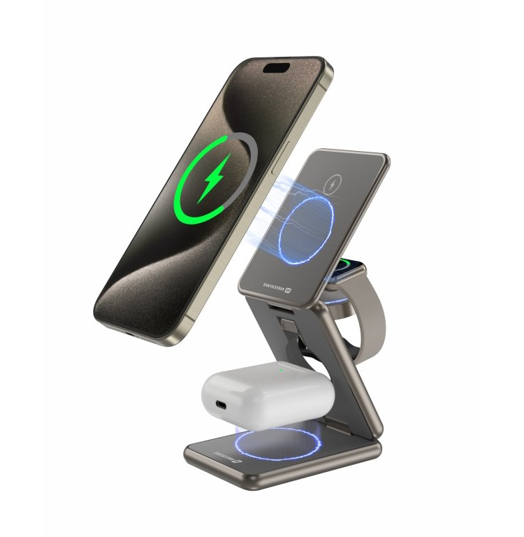 Letar du efter en pålitlig, mycket vällagrad trådlös laddare? I så fall är Swisstens 3-i-1 hopfällbara trådlösa laddare rätt val för dig. När den är hopfälld passar den praktiskt taget överallt, så när du reser med en laddare behöver du inte oroa dig för att laddare tar upp en stor del av ditt bagage. En annan fördel är att du inte behöver bära med dig många kablar; bara en räcker. Med laddaren kan du enkelt ladda tre enheter samtidigt med en total effekt på 23 watt.