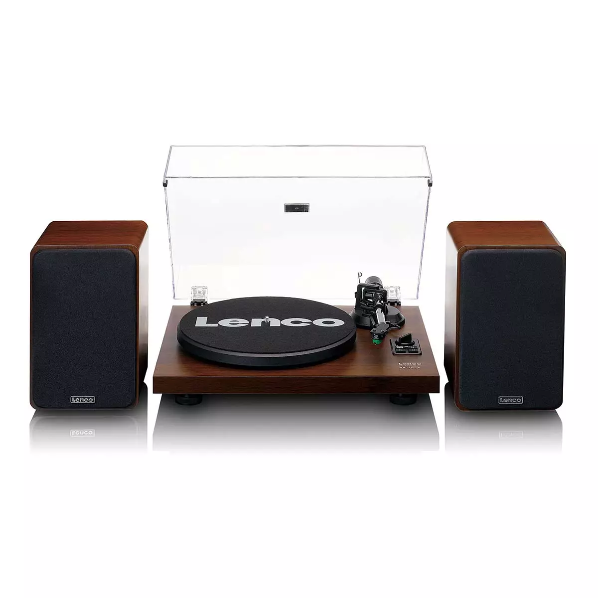The Lenco LS-600 is a record player with 2 separate wooden speakers and easy to use. This way, you can enjoy your favorite vinyl in no time, and the included speakers are easy to connect. With the adjustable speed, you can choose between 33 and 45 RPM, allowing you to easily play your precious LPs and singles. Main product features: • Bluetooth® streaming to the device• Belt drive with two speeds• Output power of 2 x 30 W RMS• Moving magnet cartridge AT-VM95E• Dust cover• Anti-slip With the Lenco LS-600, you have everything you need to relive the warm sound of your favorite records. The LS-600 conceals the latest technology in a classic design: a carbon fiber arm with a detachable headshell equipped with an Audio-Technica cartridge AT-VM95E. It offers you a warm sound of Hi-Fi quality. The built-in Bluetooth® function makes the LS-600 suitable for streaming music from your smartphone to the record player's speakers. The LS-600 has a detachable plastic dust cover and is available in a dark walnut wood color. What's in the box? • Record player with 2 speakers• Dust cover• Power adapter CE-US• Counterweight• Anti-skating weight• Slipmat• 45 RPM adapter• Drive belt• Speaker cable 2x• Bracket key• Alignment board for cartridge• Dust cover foot 2x• User manual NL / EN / DE / FR / ES / IT / RU / DK / SW