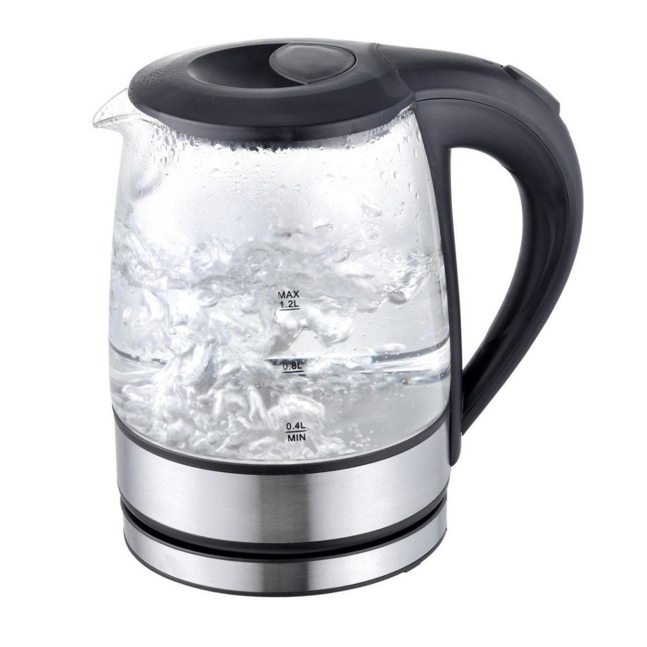 Praktisk storlek 1,2l snygg och effektiv 1500W vattenkokare gjord av rostfritt stål och glas. En genomskinlig vattenkokare och locket kan lätt öppnas.