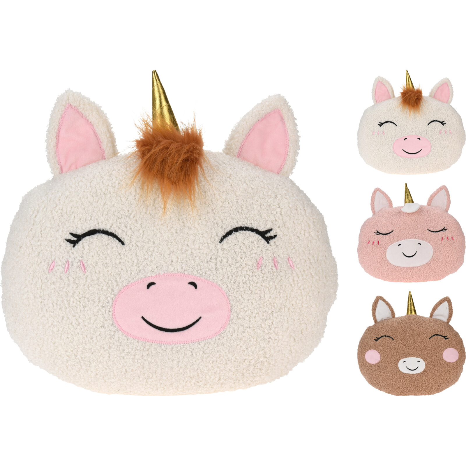 Mjuk teddytygkudde med enhörningstema, tillgänglig i tre färger.