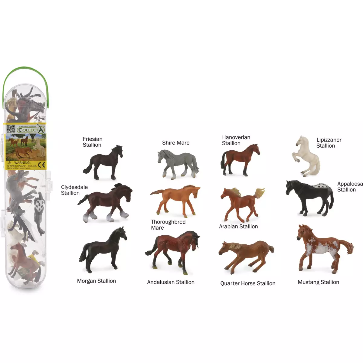 CollectAs mini hästar i tub erbjuder en samling av tolv olika hästfigurer. Dessa noggrant handmålade miniatyrhästar inspirerar barn att utforska världen av ridning och bondgårdsliv i lekfull form.