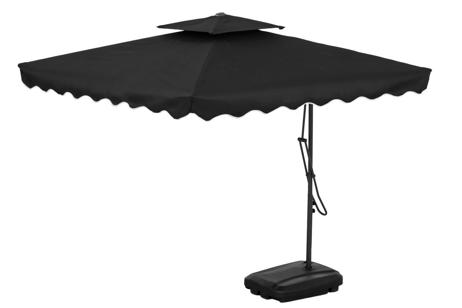 Snyggt svart rektangulärt parasoll med en diameter på 2,5 meter. Parasollet levereras med en 60-liters vattenpåfylltbart plastfot med hjul för enkel rörelse.