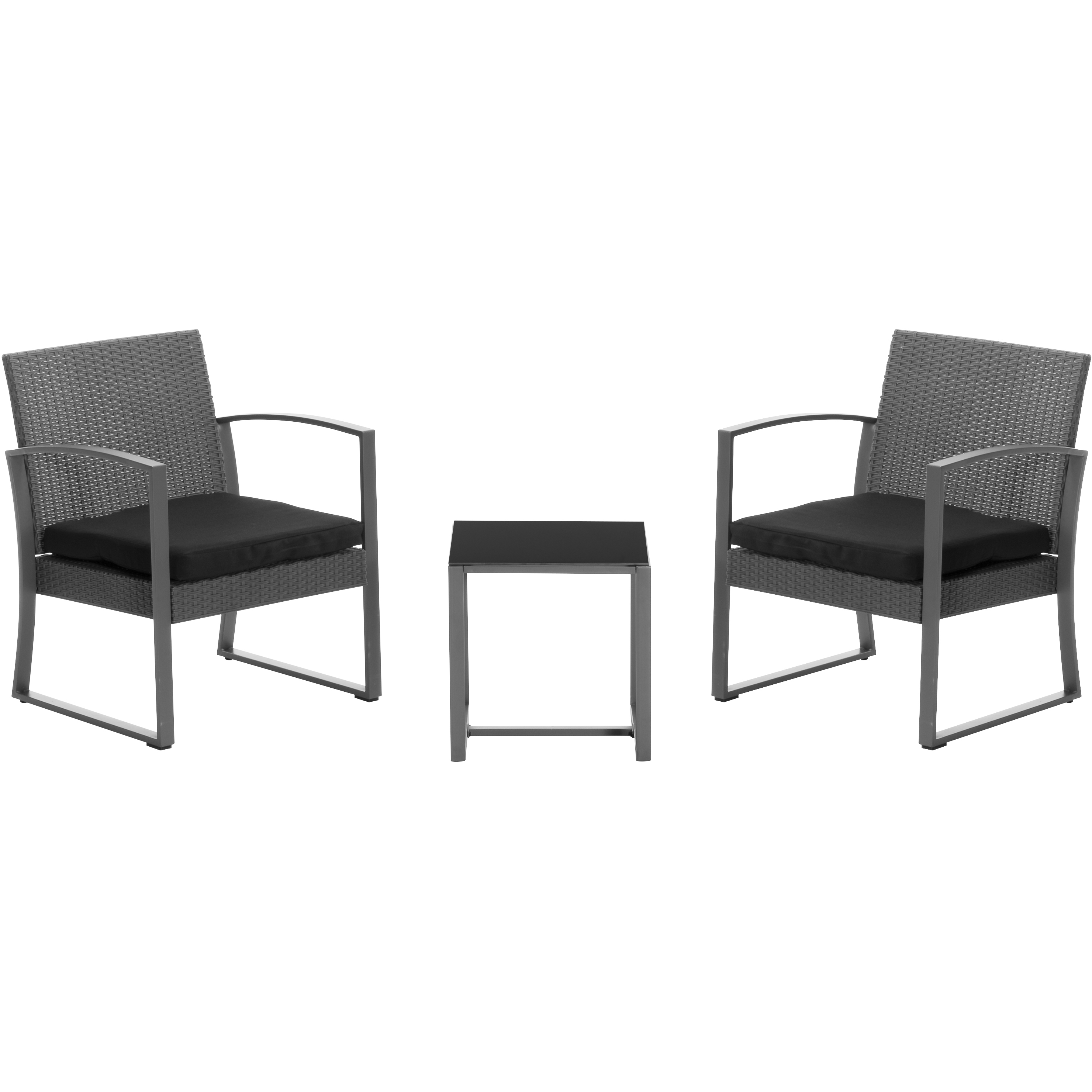 Stilfull och klarlinjerad balkongmöbel som inkluderar två stolar med stålstomme och ett bord. Möblernas flätningar är gjorda av hållbart polypropen. Mått: stol 59 x 63 x 73 cm. Bord 40 x 40 x 41 cm med 5 mm tryckt härdat glas. Inkluderar sittdynor tillverkade av polyester. Stolens maximala belastningskapacitet är 120 kg.