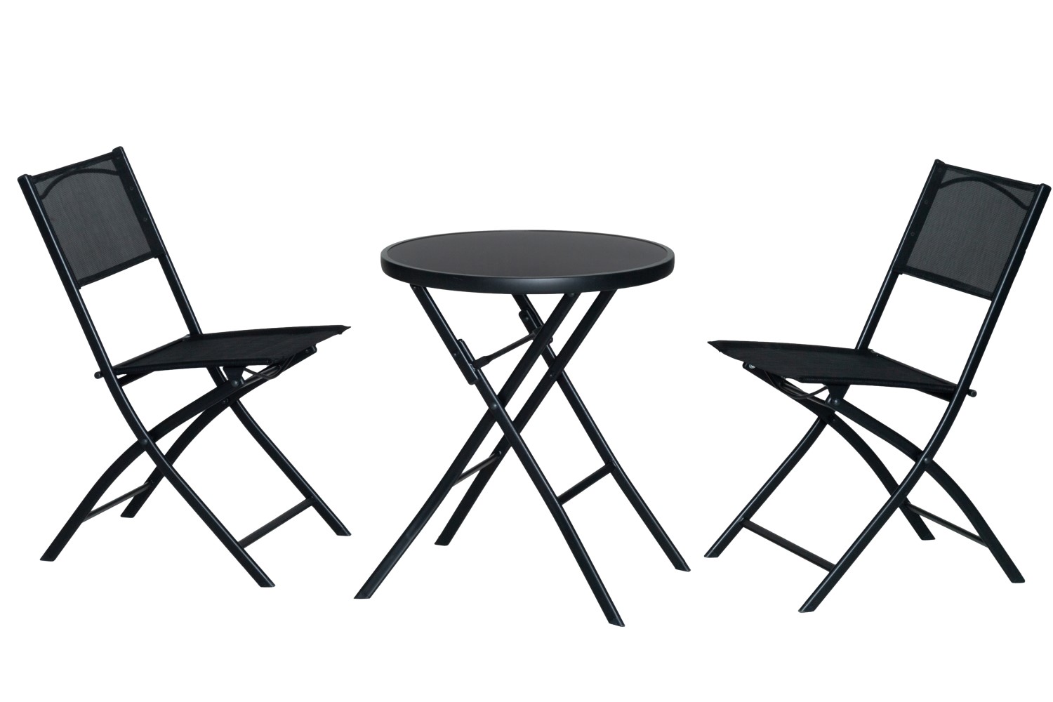 Bordsdiameter 60 cm, höjd 70 cm. Stolar 46 x 56 x 83 cm. Kroppsrör i svart pulverlackerat stål 30 x 15 mm. Bordsskiva tillverkad av tryckt härdat 5 mm glas. Tygdelarna på stolarna är gjorda av 1x1 textiltyg. Stålstomme, hopfällbar balkongmöbelset med bord och två stolar. Max 120 kg.