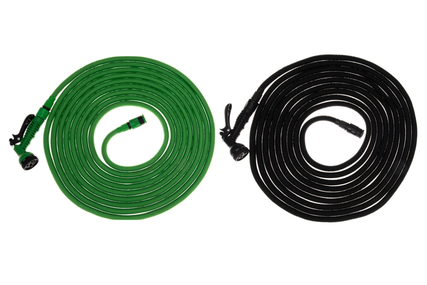 En elastisk vattenslang med en slitstark 2 mm innerslang av latex i dubbelt lager och ett ytterlager av mycket stark stickning. Denna kombination av material garanterar bästa möjliga livslängd för de töjbara slangarna.