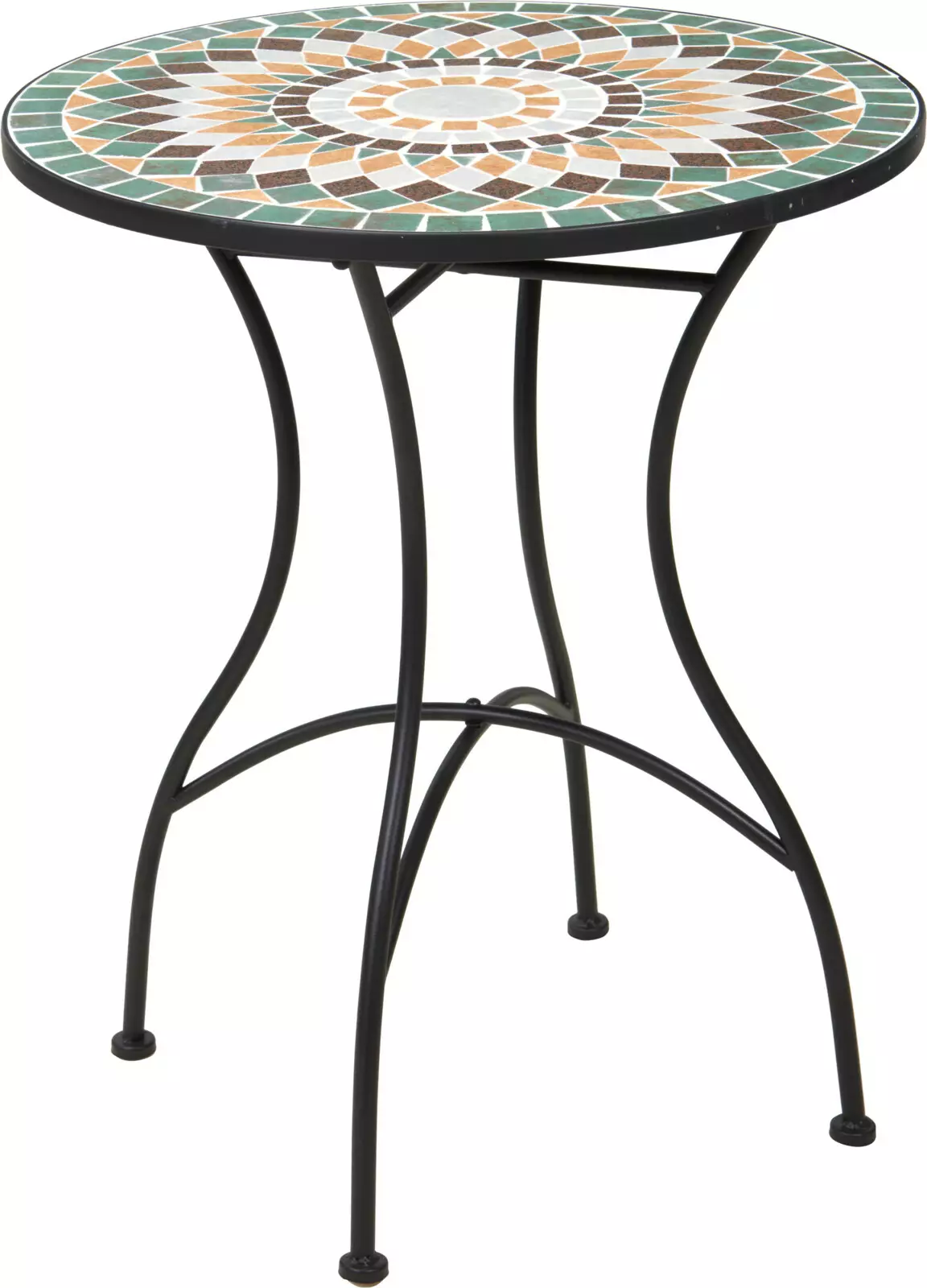 Upptäck ett elegant bistrobord som ger både karaktär och färg till din uteplats, balkong eller ett litet kök. Den runda bordsskivan är rikt utsmyckad med ett geometriskt, symmetriskt mosaikmönster i nyanser av grönt, vitt, brunt och ockra. Varje liten bit i mosaiken bidrar till det unika, ringformade motivet som ramas in av en mörk kant. Kombinationen av naturinspirerade färger och konstnärlig design gör att bordet drar blickarna till sig – perfekt när du vill skapa en trivsam plats för morgonkaffet, en fika med vänner eller en stunds avkoppling utomhus.