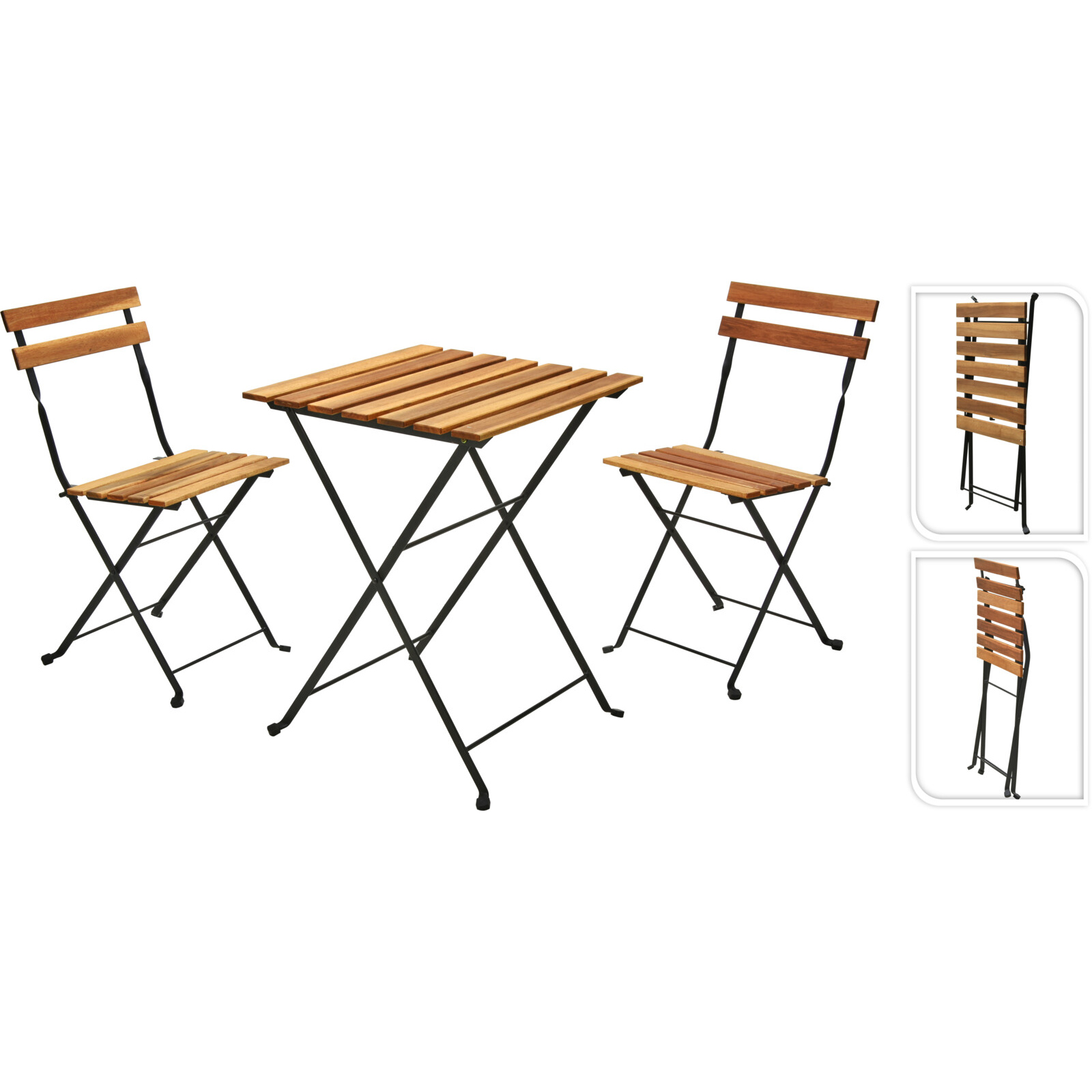 Akaciaträ bistroset, svarta metallben, vikbar mekanism.