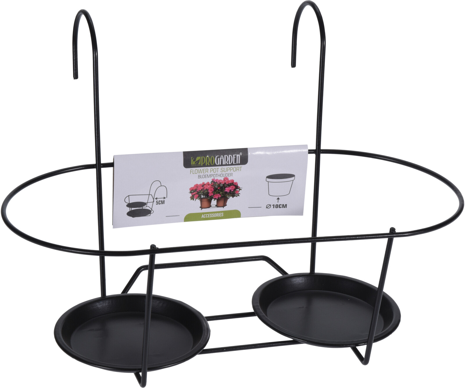 Metallisk blomkrukshållare för två krukor med diameter 132 mm. Svart färg, robust konstruktion.