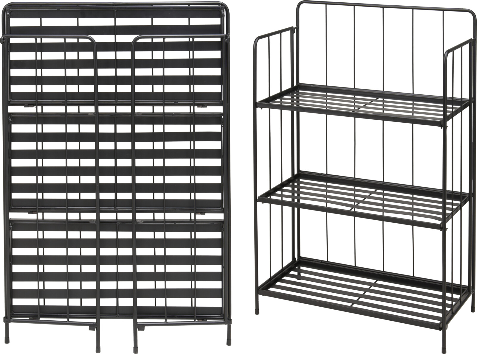 Snyggt hopfällbart blomsterställ med tre hyllplan. Växtställningen är gjord av svart metall. En modern lösning för blomkrukor eller andra prydnadsföremål hemma.