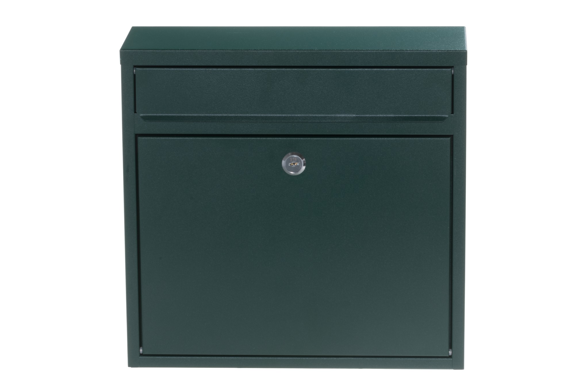 En enkelt stilren baspostlåda i stål. Grön pulverlackerad yta. Cylinderlås, levereras med två nycklar.