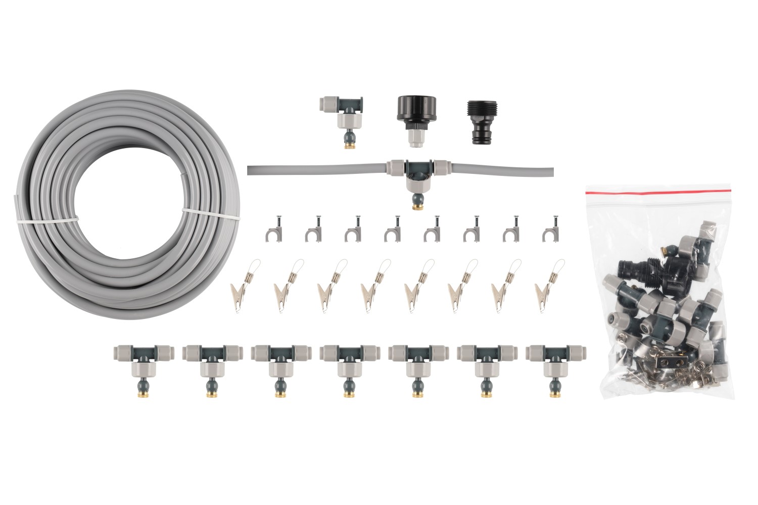 Ett mångsidigt system som producerar fin vattendimma för antingen bevattning eller kylning. Kan installeras i växthus, växtstöd, terrasser, paviljonger, parasoll, studsmatta etc. Justerbar orientering i mässingsmunstycken. Satsen innehåller 15 m vattenslang, 8 sprutmunstycken, 8 spikklämmor, 8 hängklämmor och en snabbkoppling för montering av vattenslang. Låg vattenförbrukning, vid ett tryck på ca 2 bar förbrukning endast 2 liter per timme. Nödvändigt minimitryck 1,5 bar. Systemet kan göras större genom att ansluta det till ett annat liknande system.