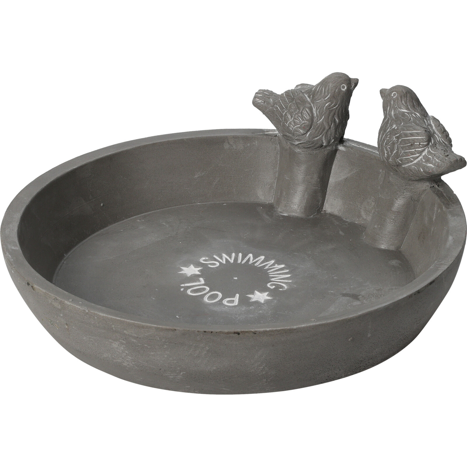 Grått fågelbad av magnesiumoxid, storlek 24,5 x 23,5 x 6,5 cm, vikt 1,069 kg. Perfekt för att ge fåglar lättnad under värmeböljor.