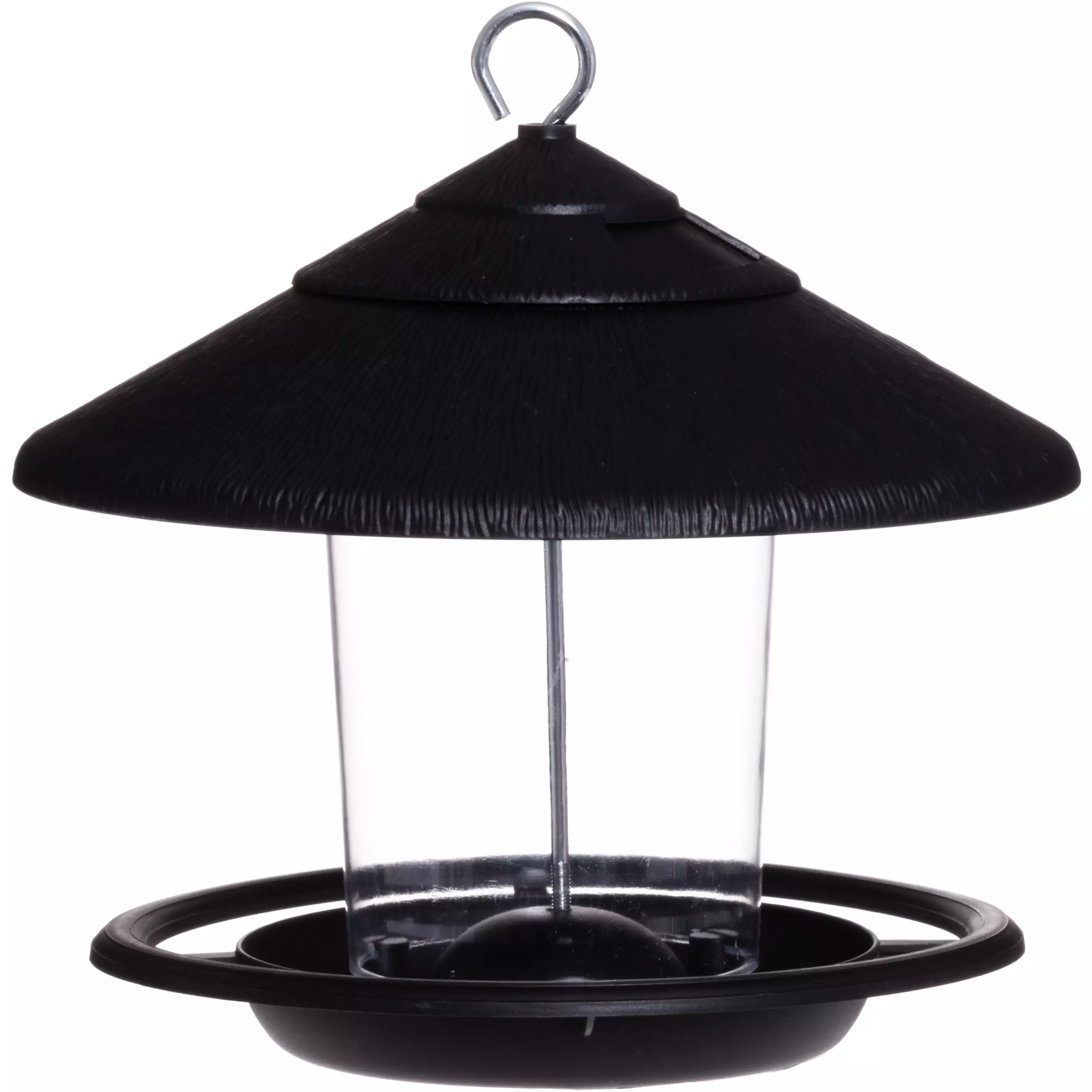 Grå fågelmatare med praktisk påfyllningslucka för fågelmatning.
