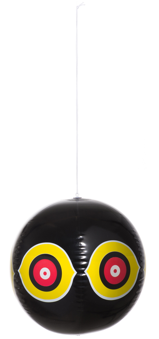 En fågelskrämma, ballong med stora ögonliknande mönster. Inkluderar reflekterande klistermärken på ögonen och ett snöre för upphängning.