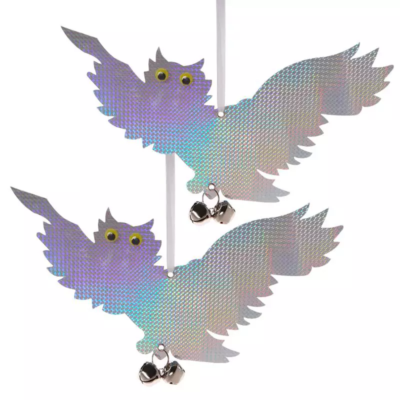 Förpackning med 2 st vaktugglor som hängs upp. Glänsande, plingande och reflekterande uggleformad fågelskrämma. Storlek 39x21cm.