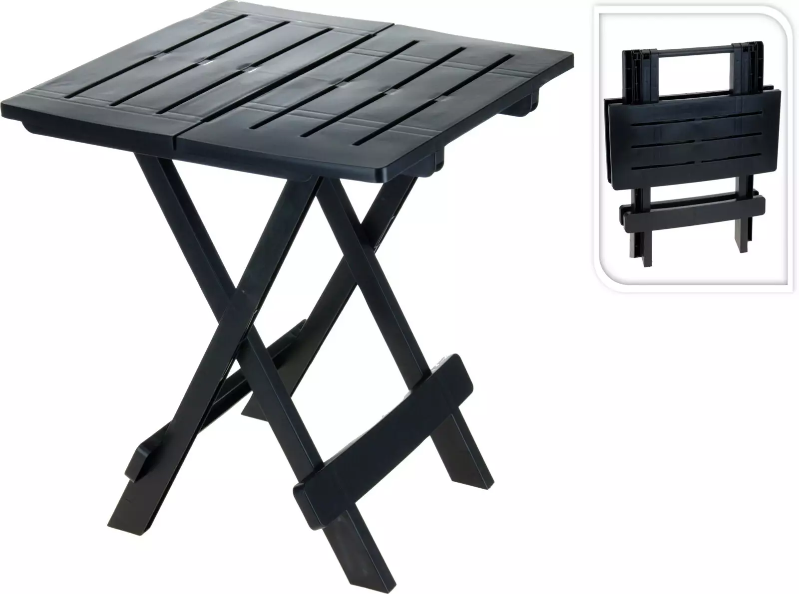 CAMPINGBORD ADIGE är ett lätt och hållbart fällbord tillverkat av polypropen. Dess gallerliknande bordsskiva och X-formade ben gör det enkelt att fälla ihop och flytta. Bordets mått är 44x44x50 cm, och det är idealiskt för små utrymmen eller utomhusbruk, som på balkongen eller i trädgården. Den antracitgrå färgen ger stil och mångsidighet. När det är hopfällt tar bordet upp mycket lite plats, vilket gör det praktiskt för förvaring.