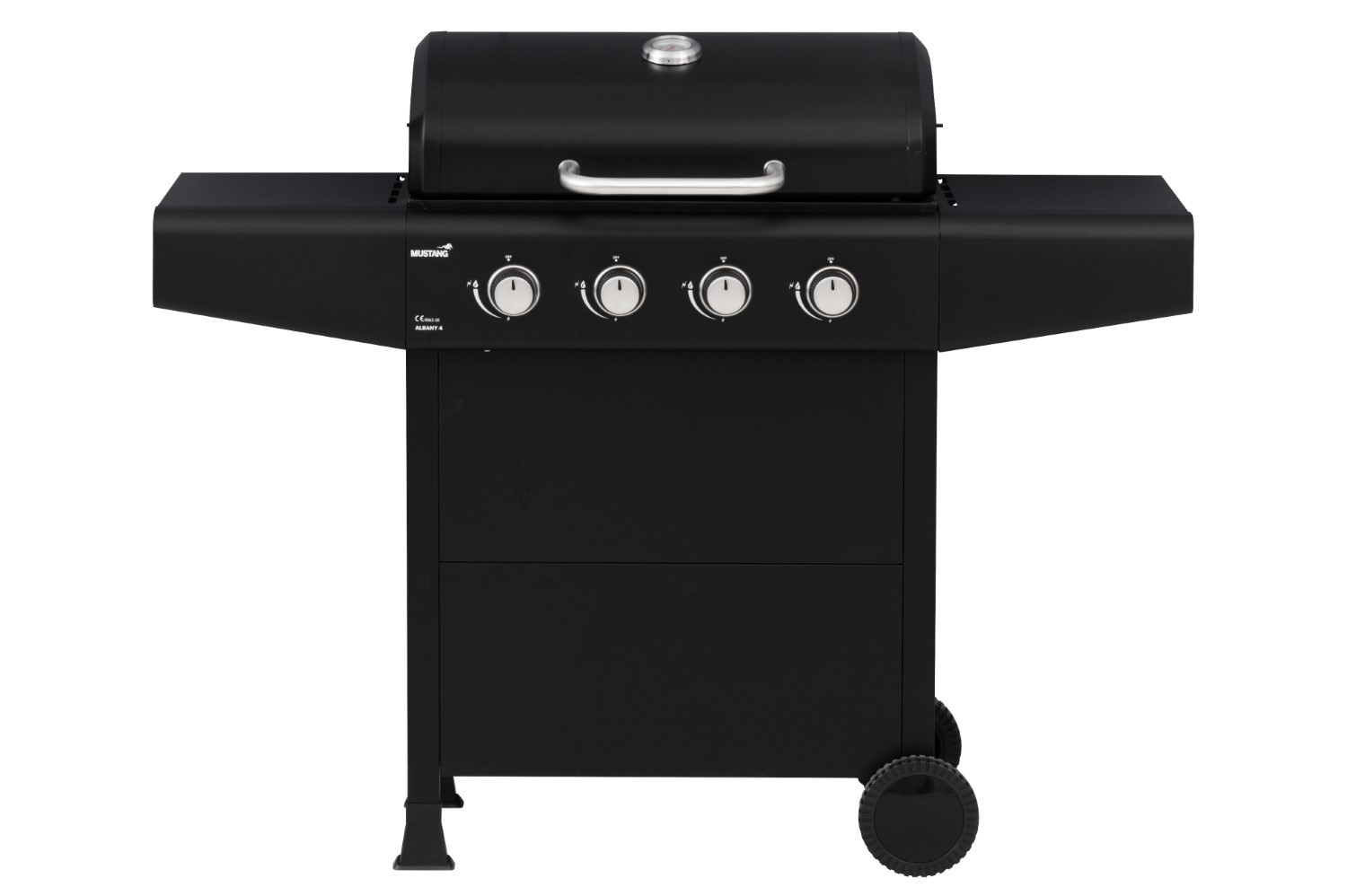 Gasgrill med 4 rostfria brännare 410. Brännareffekt 4 x 2,1 kW. Total effekt 8,4 kW. Piezo-tändning inbyggd i varje kontrollratt.