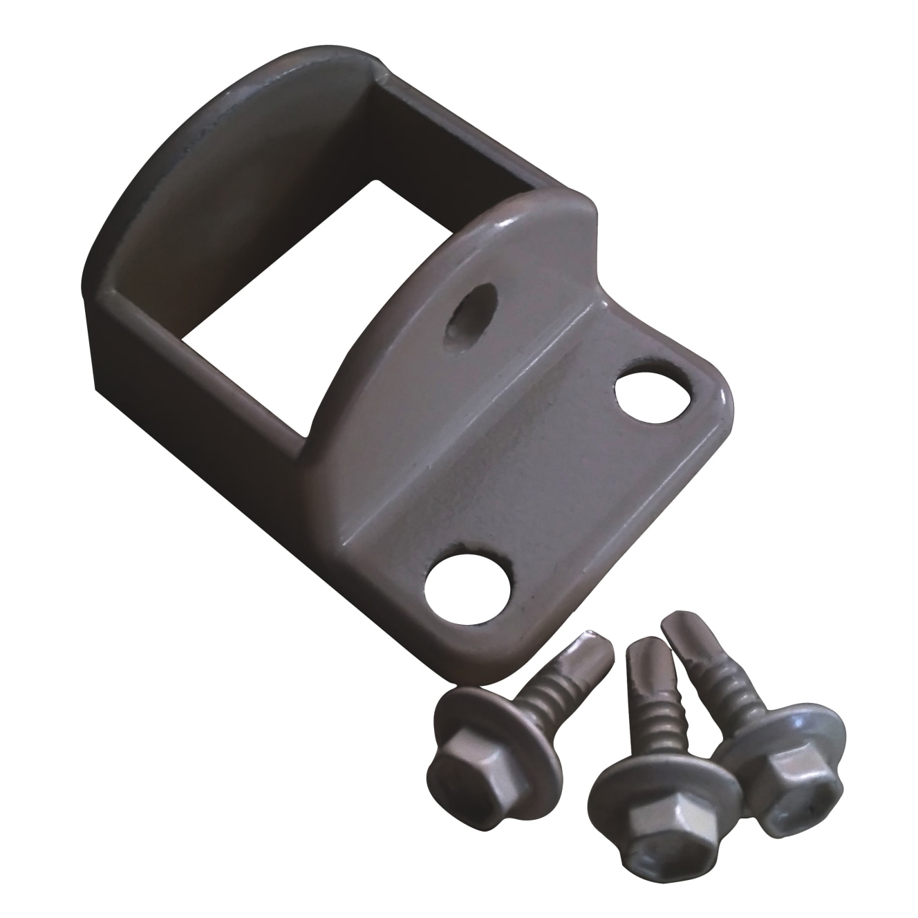 4 stycken slitstarka aluminiumstängselelementfästen och skruvar. Fästena kan installeras på valfri kant av staketstolpen, vilket gör stolpen till en ändstolpe, mellanstolpe eller hörnstolpe vid behov.