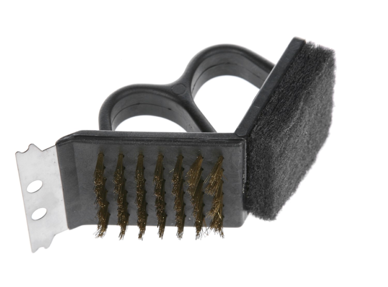 Multifunktions mässingsborste för rengöring av grillar. Skrapa, svamp och borstdel.