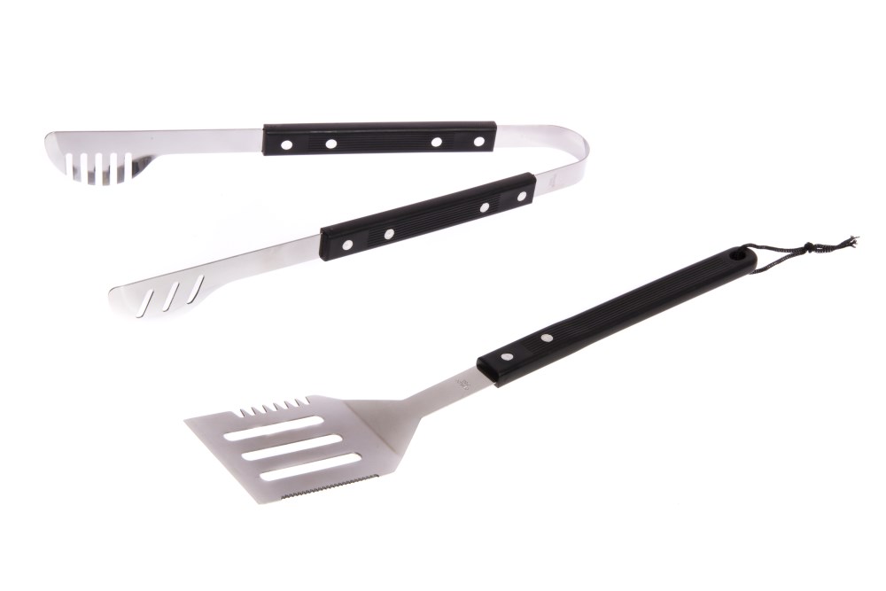 Smidiga grillredskap, en stekspade och en tång.