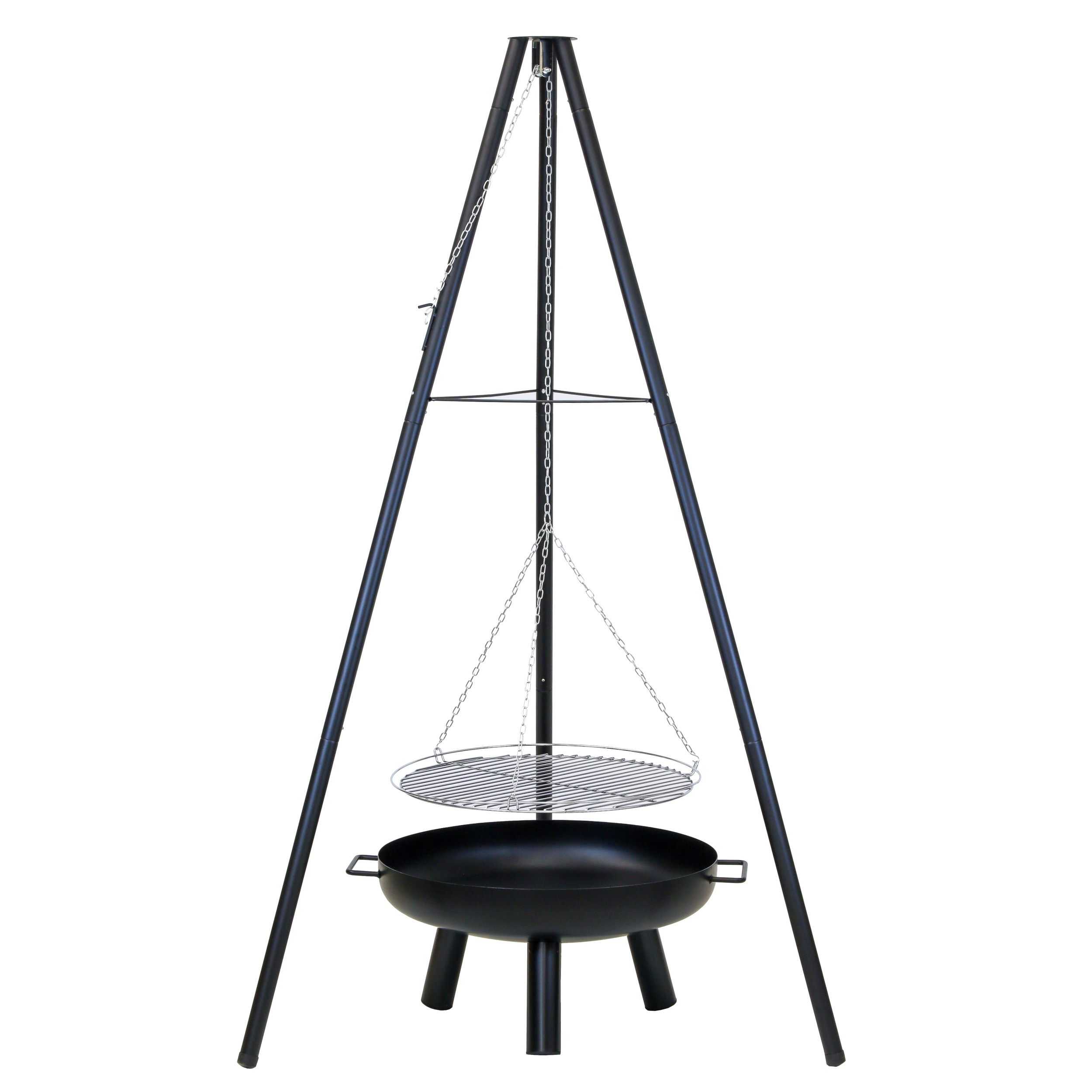 Ett grillstativ och eldskål, perfekt att ställa på tomten och skapa en mysig stund runt öppen eld. Fungerar lika bra både sommar och vinter. Gallrets höjd justeras enkelt med kedjan som är fäst på en krok.